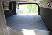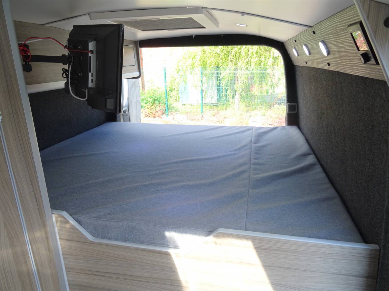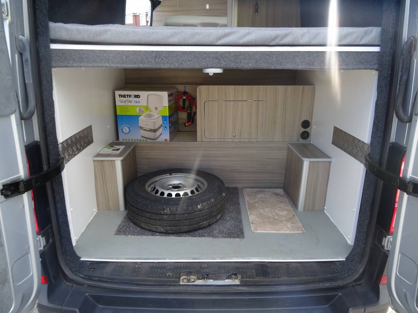Starting at the rear of the camper, there is the elevated large fixed double bed with multiple lights and a roof skylight with blinds. Beneath the bed is the large garage which has bags of storage space for multiple bikes and motorbikes. It also includes storage for the leisure batteries and gas tank along with a second shower point which is ideal for washing down equipment or pets after a muddy day out. The spare tyre is also included.