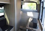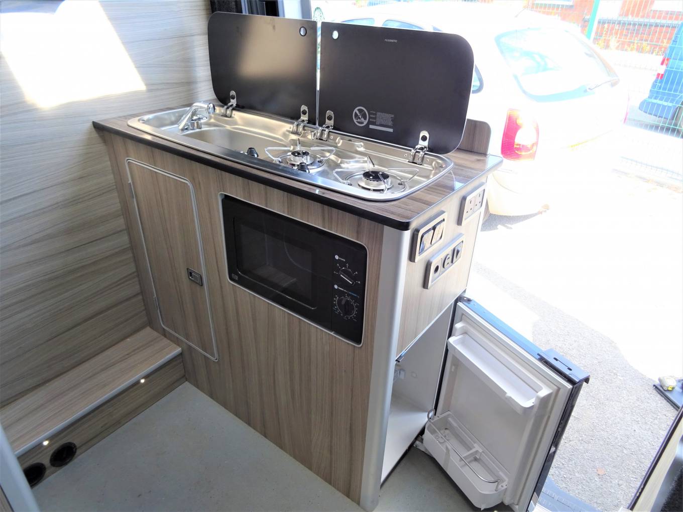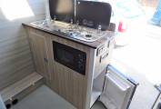 Moving through the motorhome we have a full length separate shower with instant hot water supplied from the truma heating interface and built in water tanks. Opposite this area we have the kitchen unit which includes a wash basin with mixer tap, 2 way gas hob, a microwave and a fridge with freezer compartment.