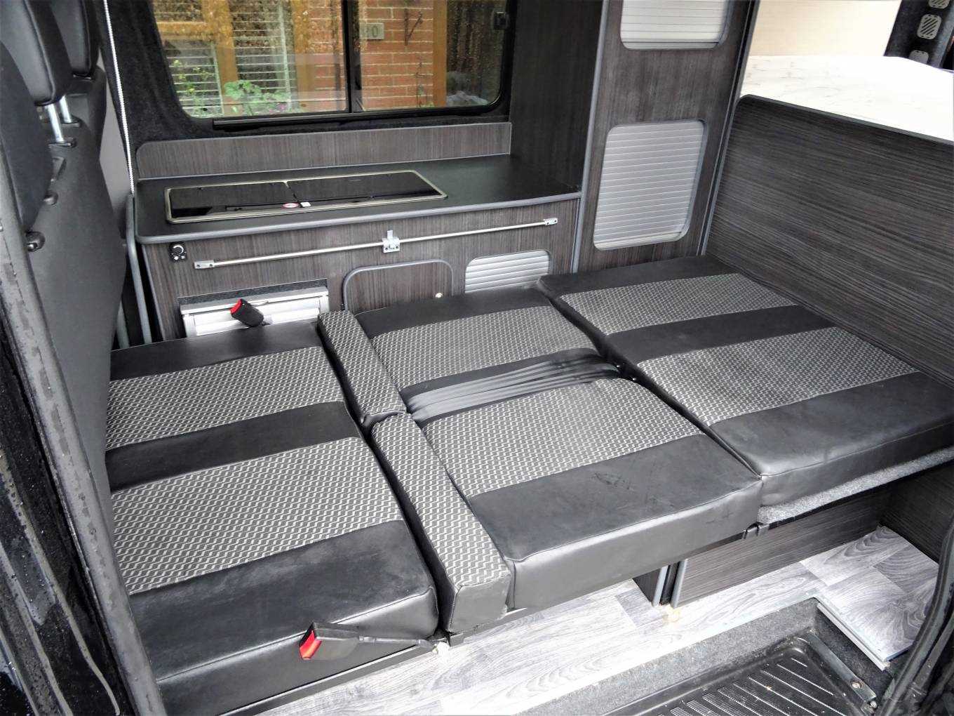 At the rear of the camper is the large fixed double bed located above the large garage which has bags of storage space. The rear 2 travelling seats pull forward to make the large double rock and roll bed. Within the vehicle there is plenty of storage units which are placed all around the roof perimeter as well as large storage cabinets on each side.