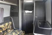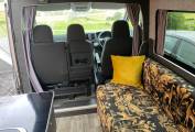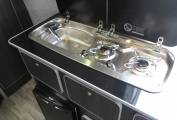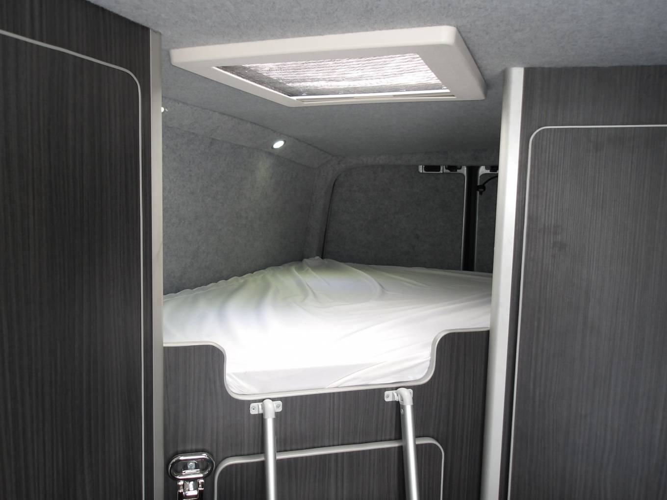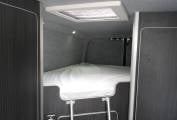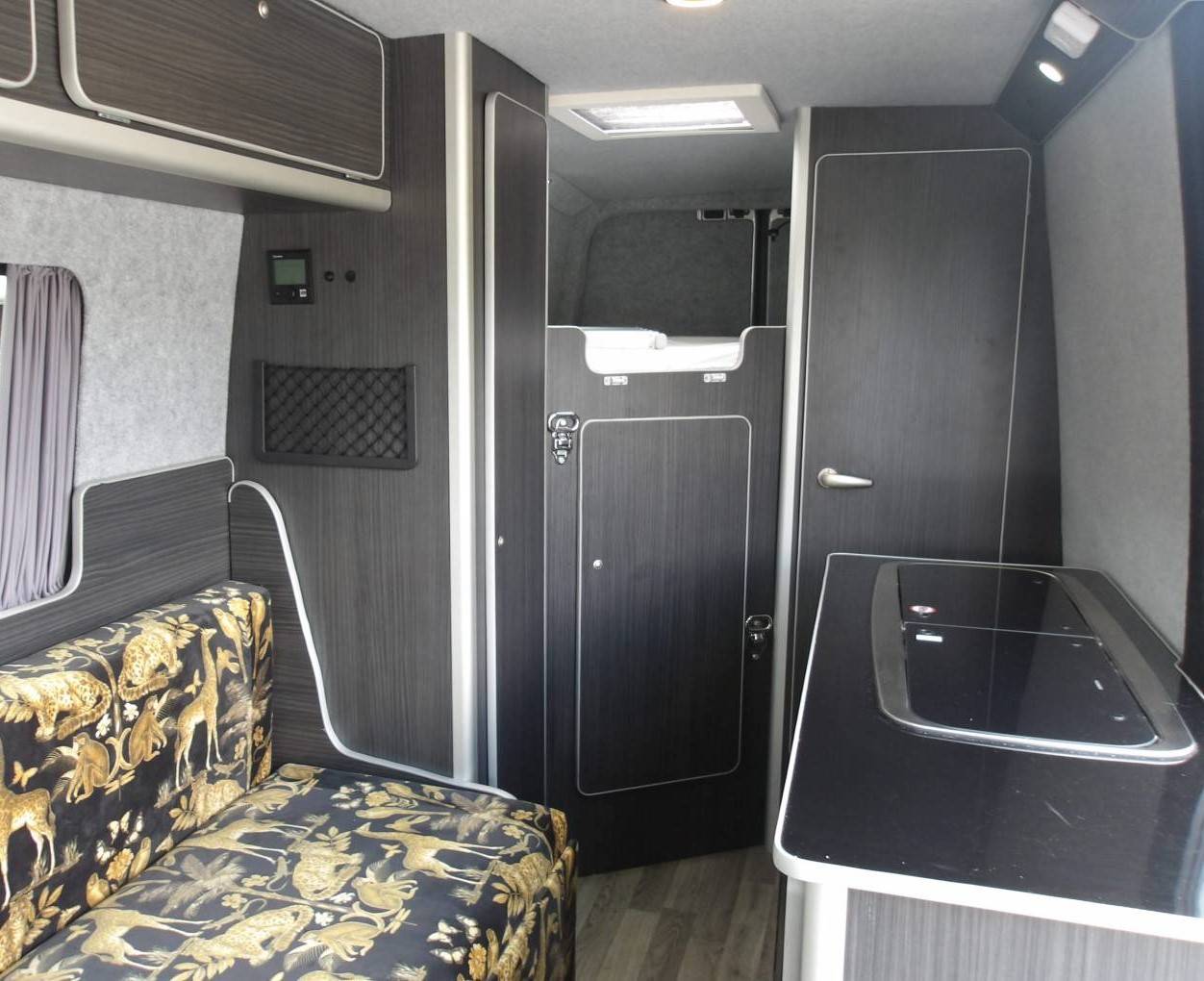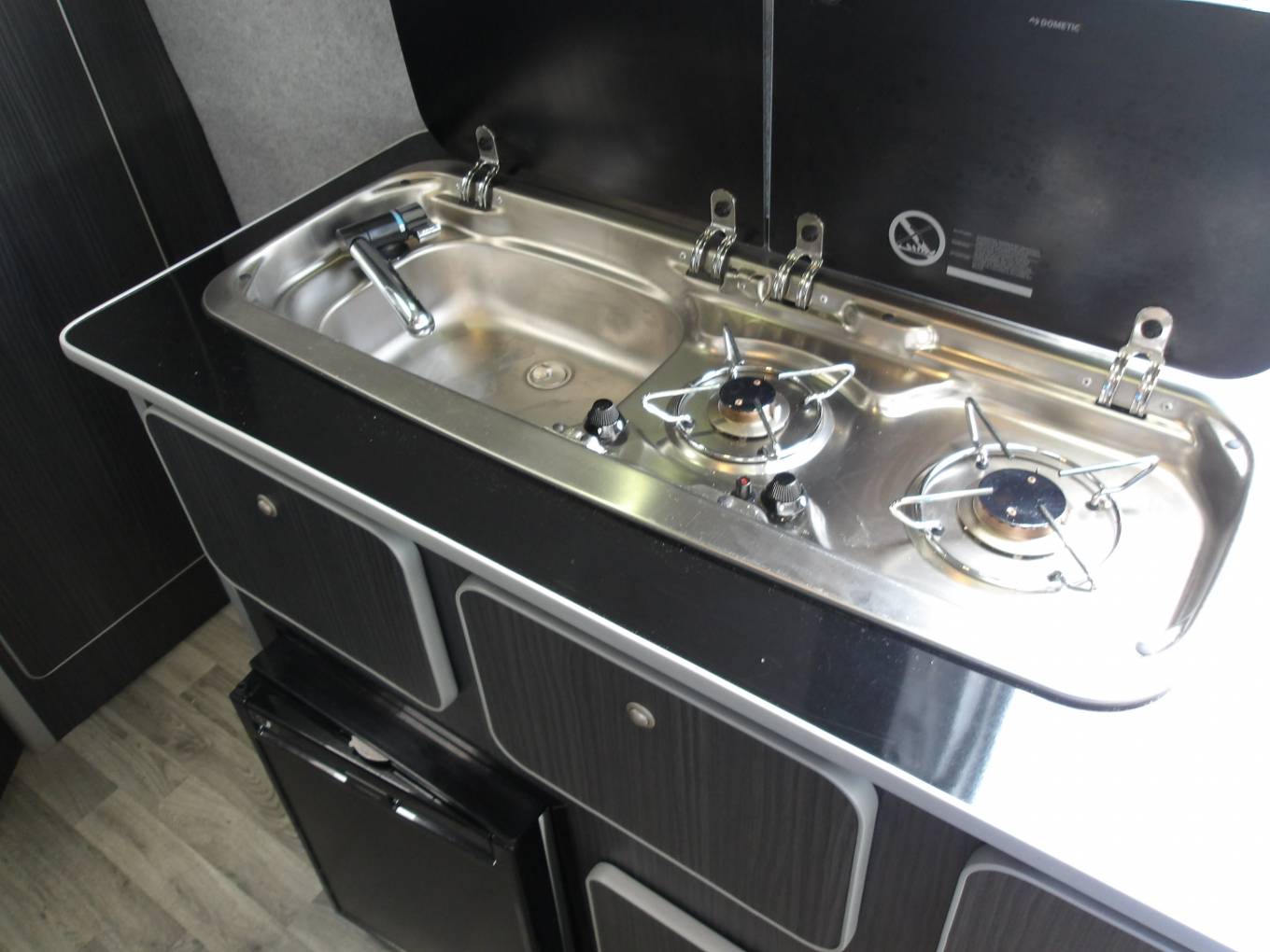 Front sofa which pulls out into a small double bed 170cm x 120cm; side kitchen with gas hob, 12v compressor fridge and lots of storage space .