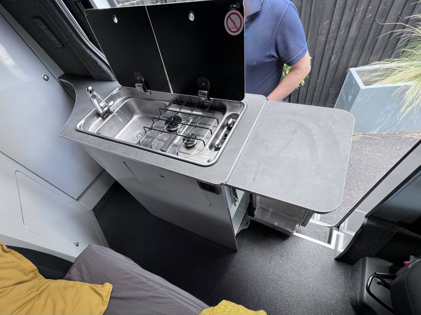 On the door side is the compact kitchen where you will find a two burner hob, sink with cold water feed, a 12 volt Dometic fridge and extending worktop.