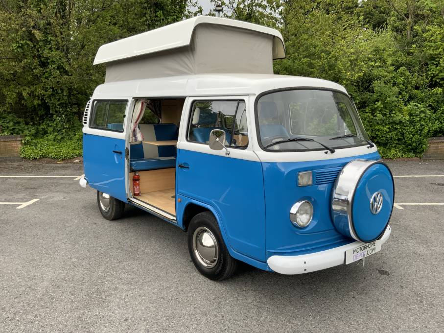 This particular example is presented in a beautiful white over bright blue with matching interior and benefits from a number of upgrades including a Webasto heater and power steering which make it a useable modern camper while still maintaining the classic VW look.
