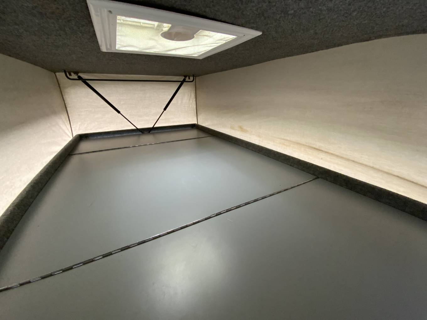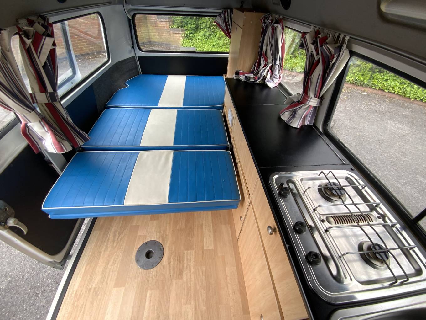 In the rear of the vehicle we have the classic VW configuration with storage opposite the sliding door, this also houses a two burner hob with grill and a small 12v fridge. The Rock N Roll bed can comfortably seat two and has two lap belts, it can also convert to a small double bed, the second sleeping area is in the pop up roof which features an opening roof light and can comfortably sleep two children.