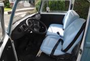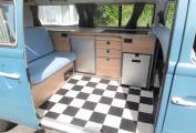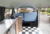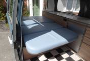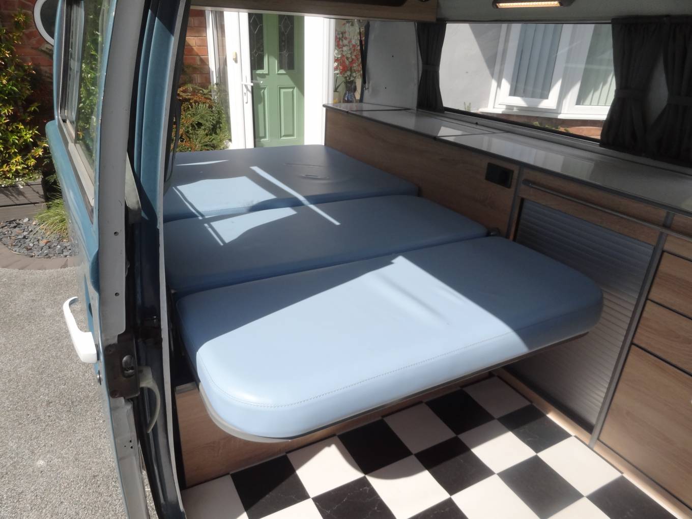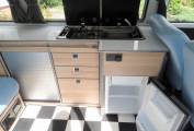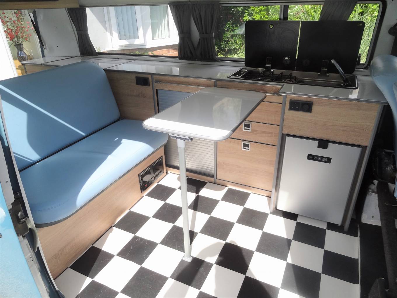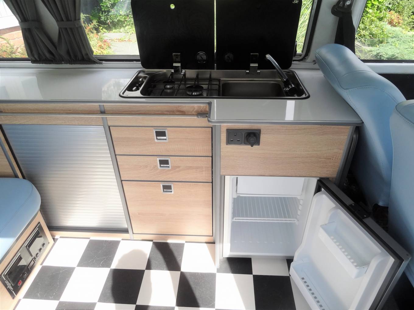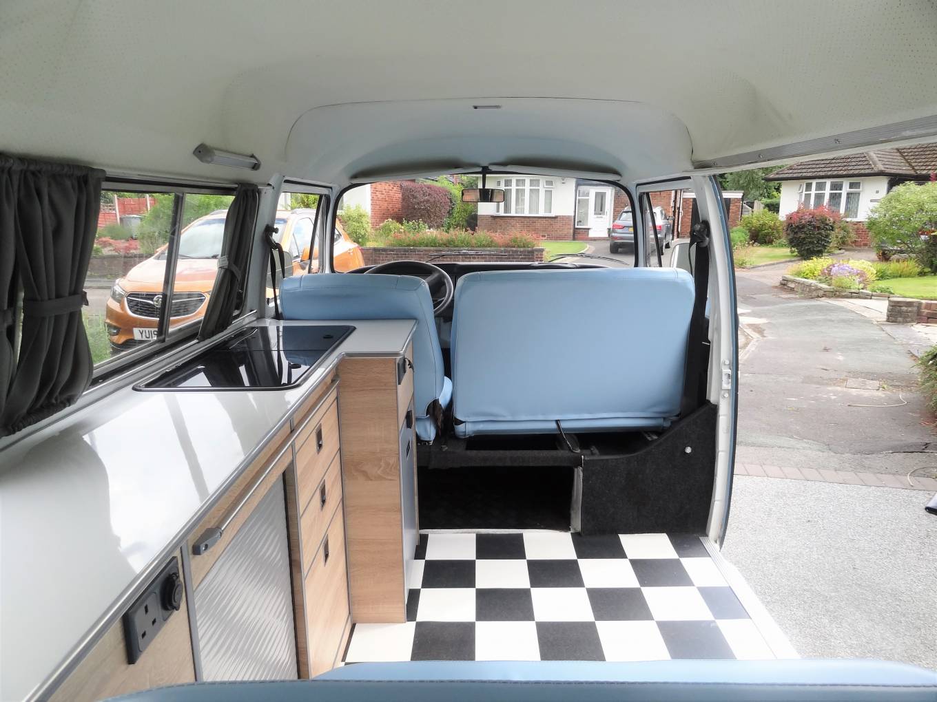 Upon entering the special camper you are face with the rear 2 forward facing traveling seats which slide out to make the large double rock and roll bed. On the drivers side is the popular 2 ring gas hob supplied by the gas bottle located underneath along with a stainless steel sink and fridge with freezer compartment. There also several large storage compartments around this camper ideal for clothes, equipment or even a porta potti.