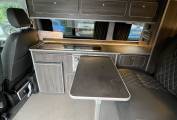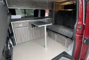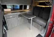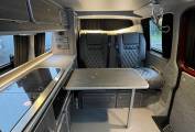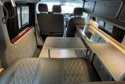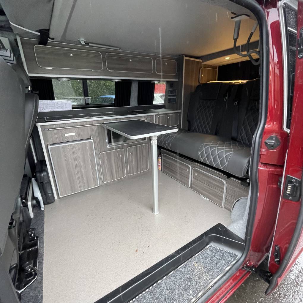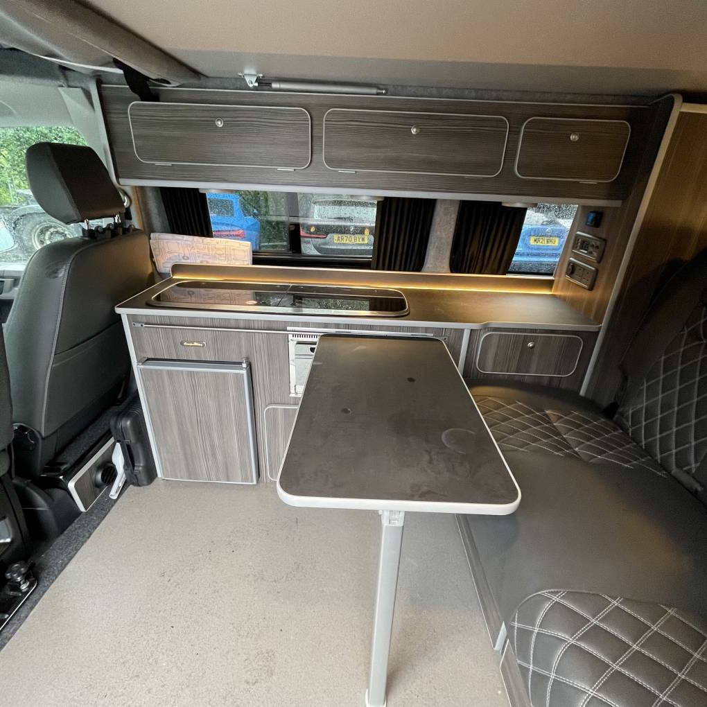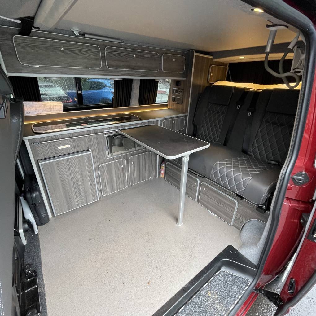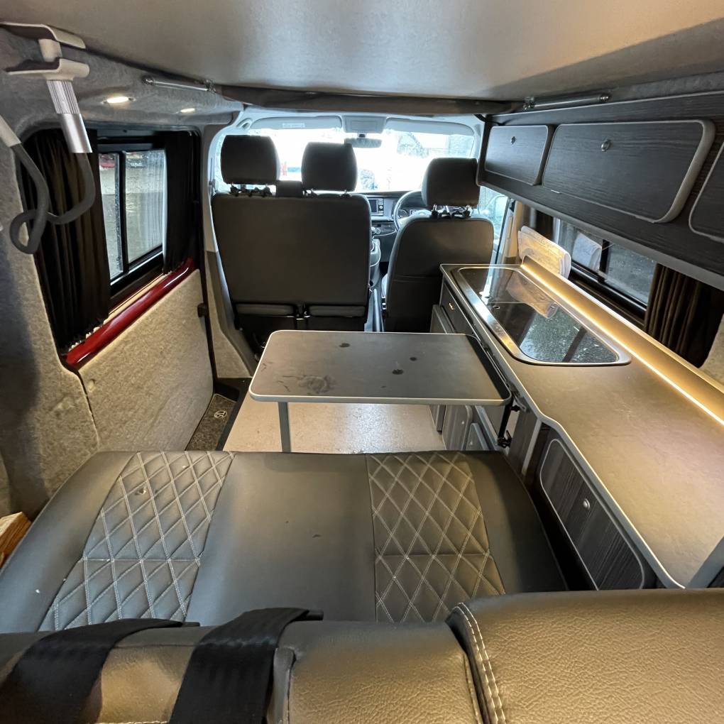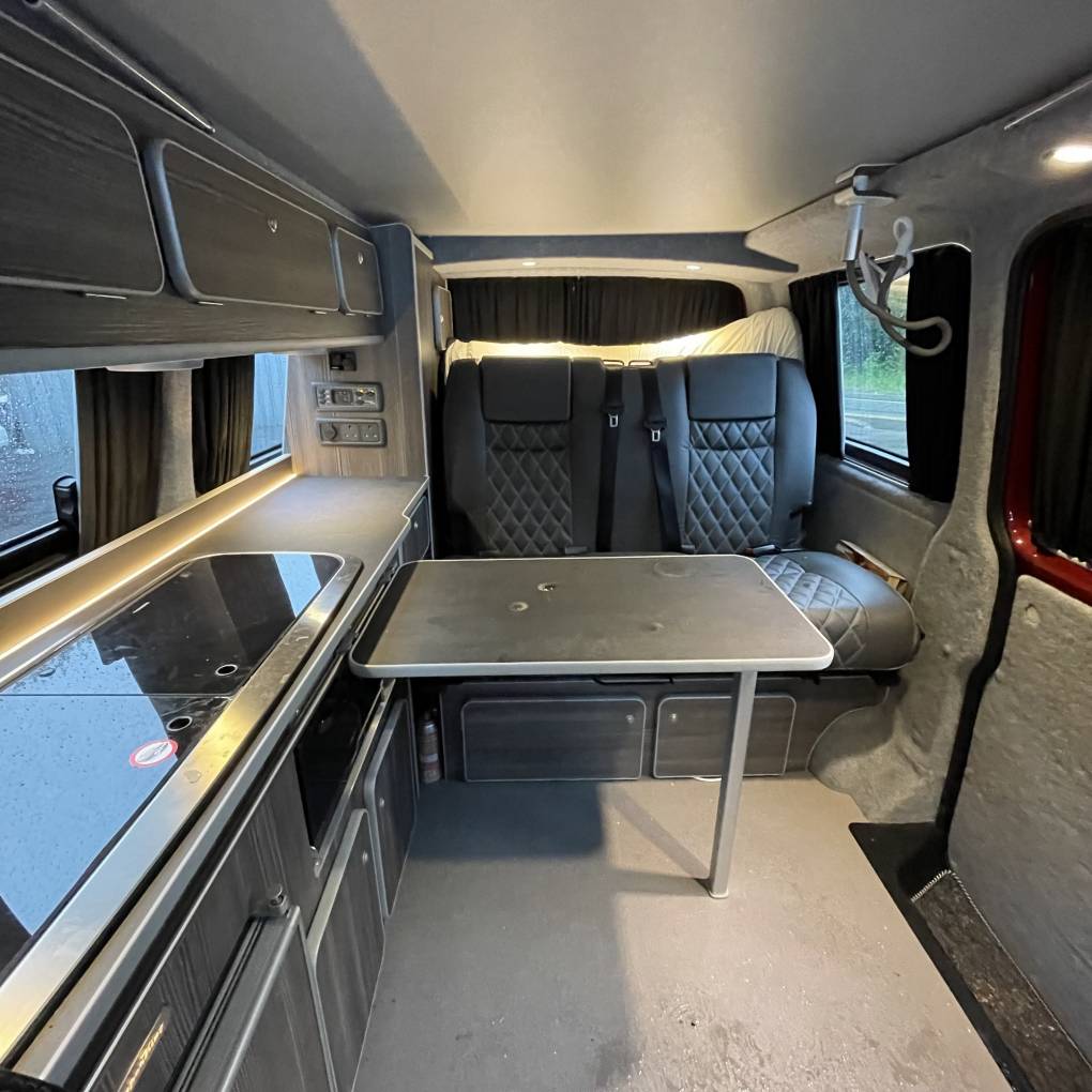 This high level quality conversion offers a 4 berth sleeping capacity along with 5 travelling seats. The cab which boasts 3 of the 5 travelling seats also has the 2 swivel chairs that can be turned around using the swivel plate to face the centre dinette and the remaining 2 travelling seats. In the Cab there is a display unit which includes apple car play, bluetooth phone and more vehicle information.