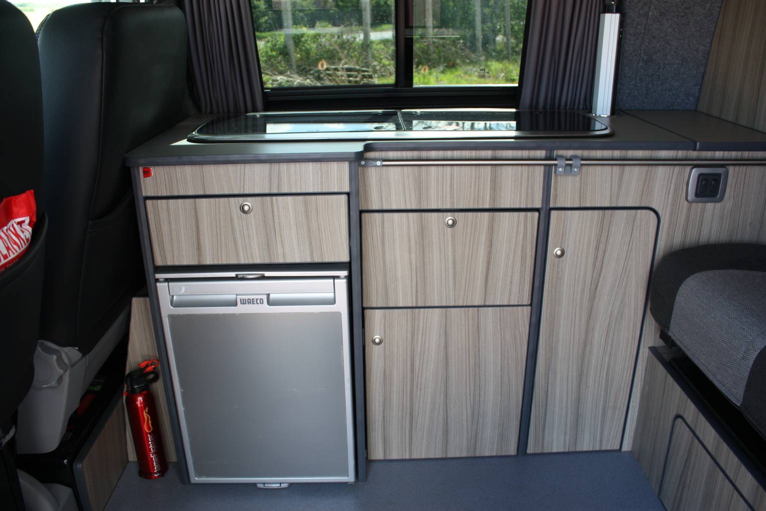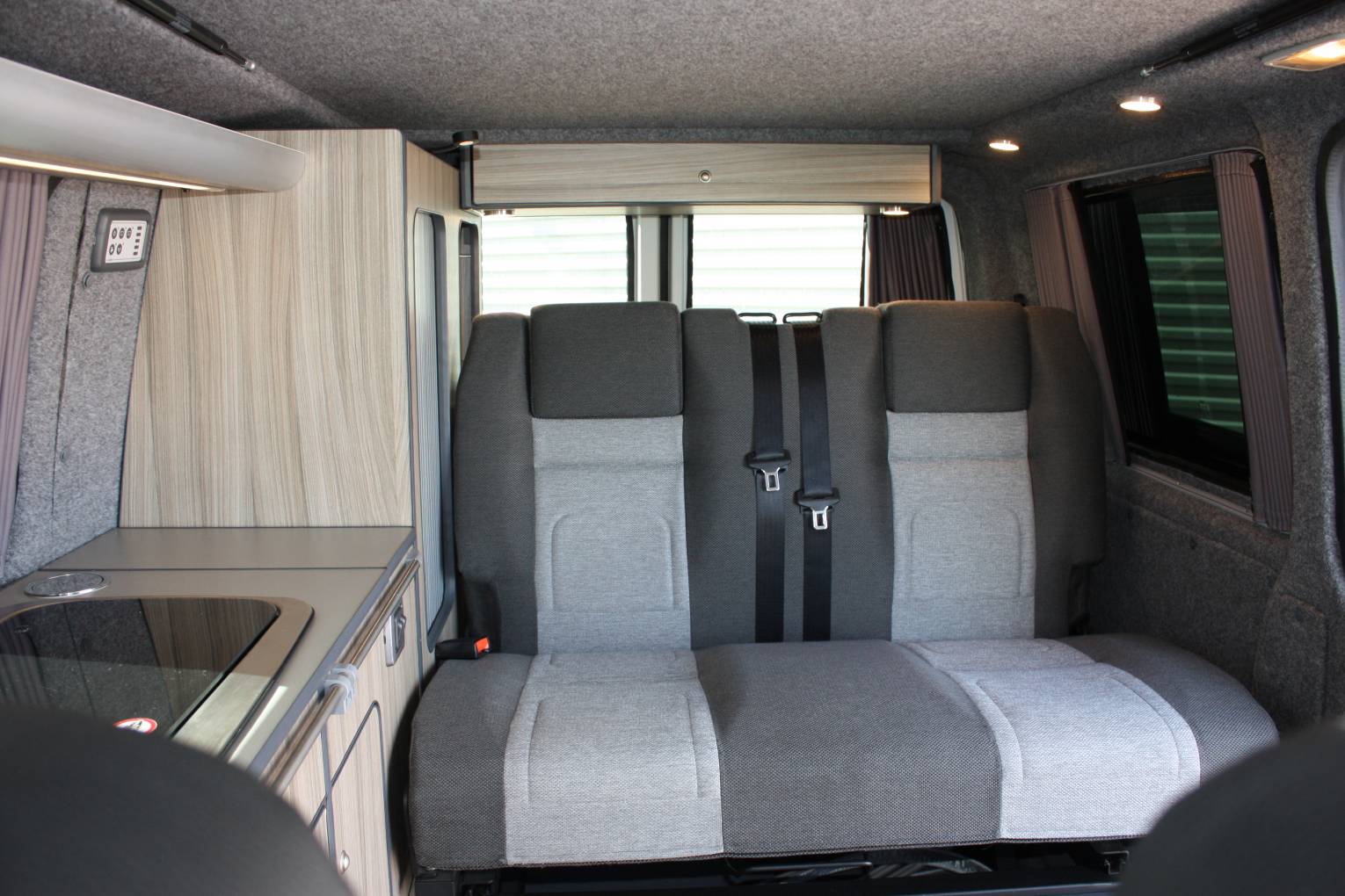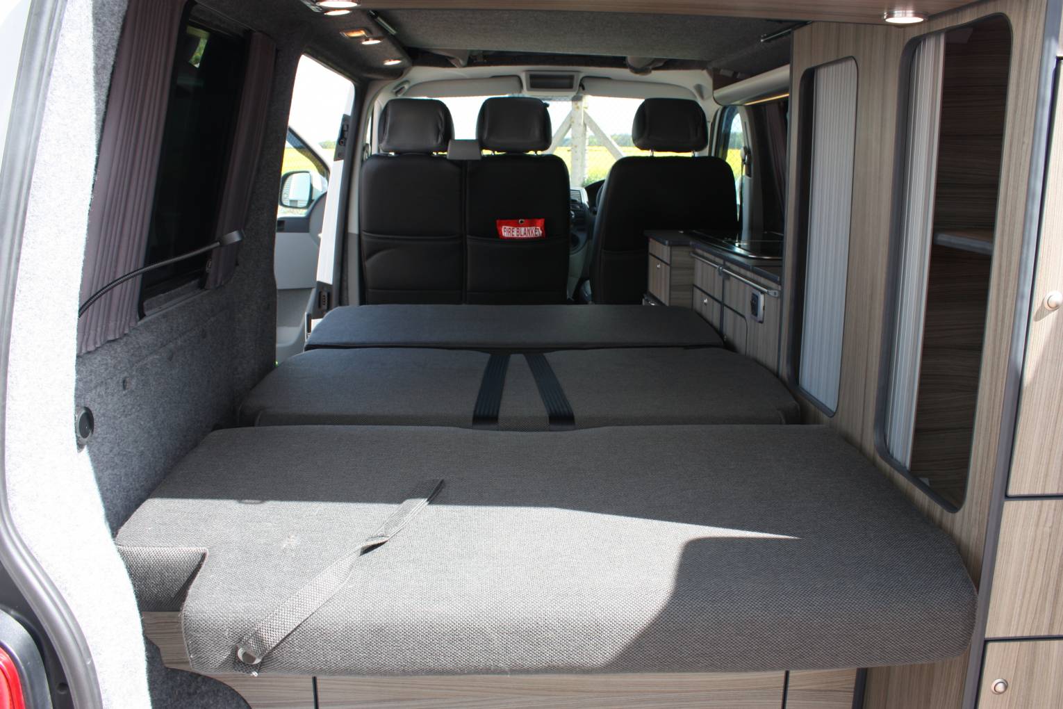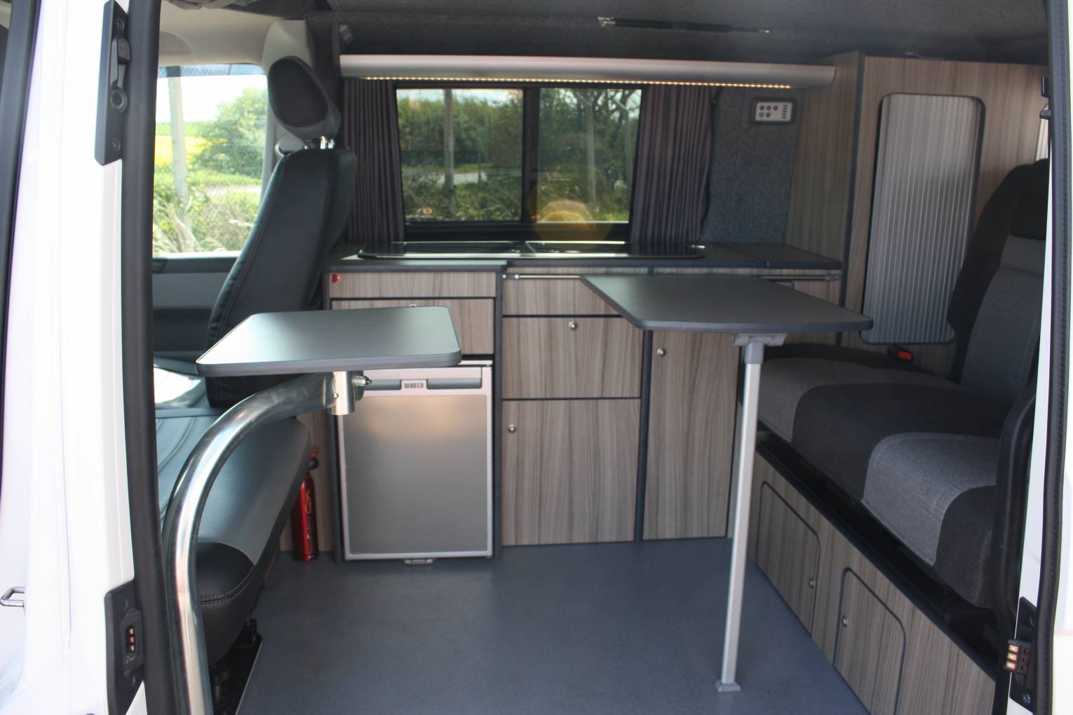 Firstly, we start in the cab which features a two seat swivel bench and a pioneer radio with reversing camera. The rear seat is a RIB bed and features two 3 point seatbelts completing 5 seatbelts in all. The rear seat converts with ease into a comfortable double bed. There is plenty of storage in this Camper Van to the rear and around the kitchen. The kitchen includes a 2 ring gas burner, wash basin, WAECO CRX50 fridge and 2 dinette tables. Above is the pop top roof with zip windows which sleeps 2 comfortably and when the bed is pushed up gives plenty of head room below.