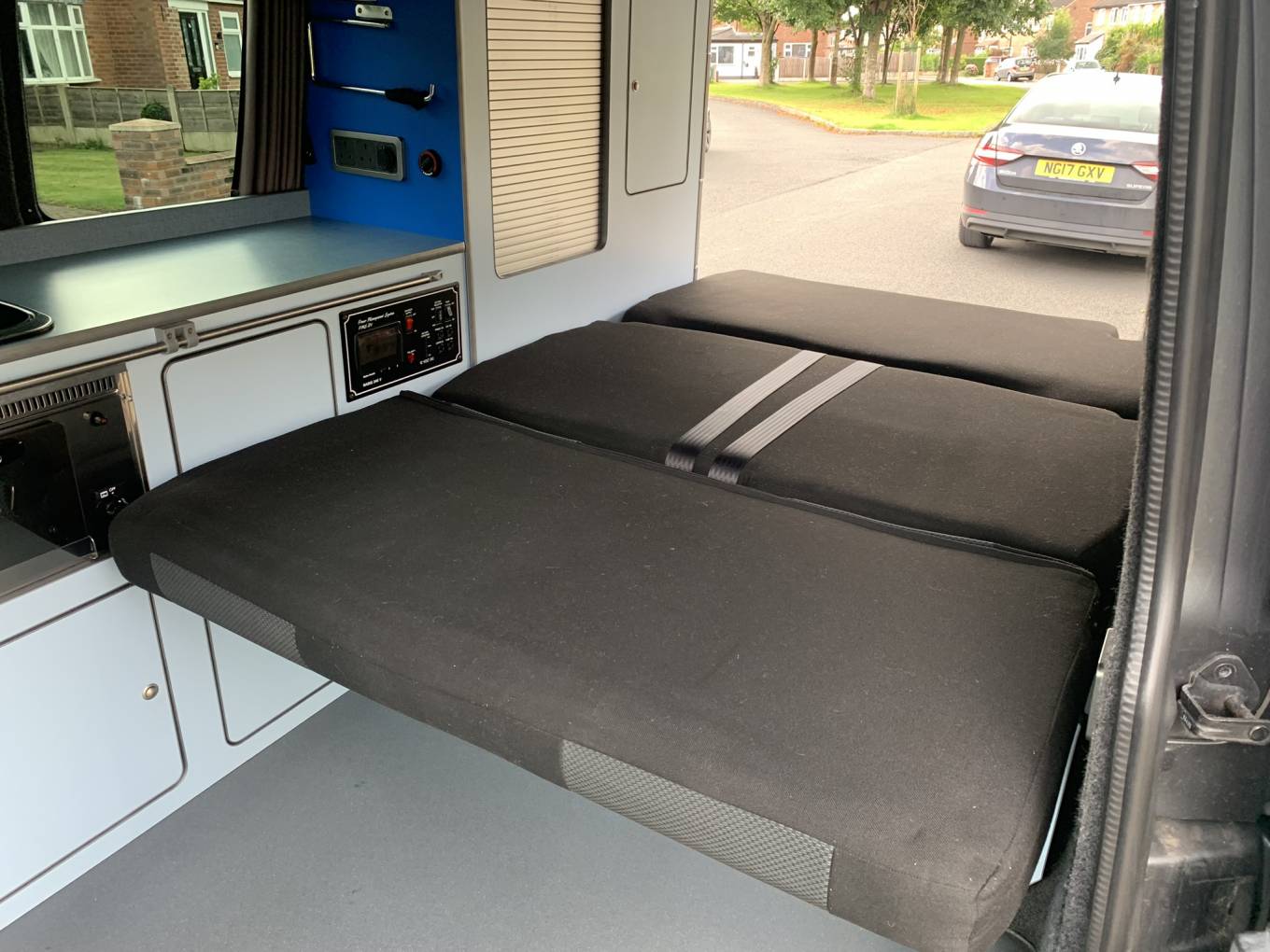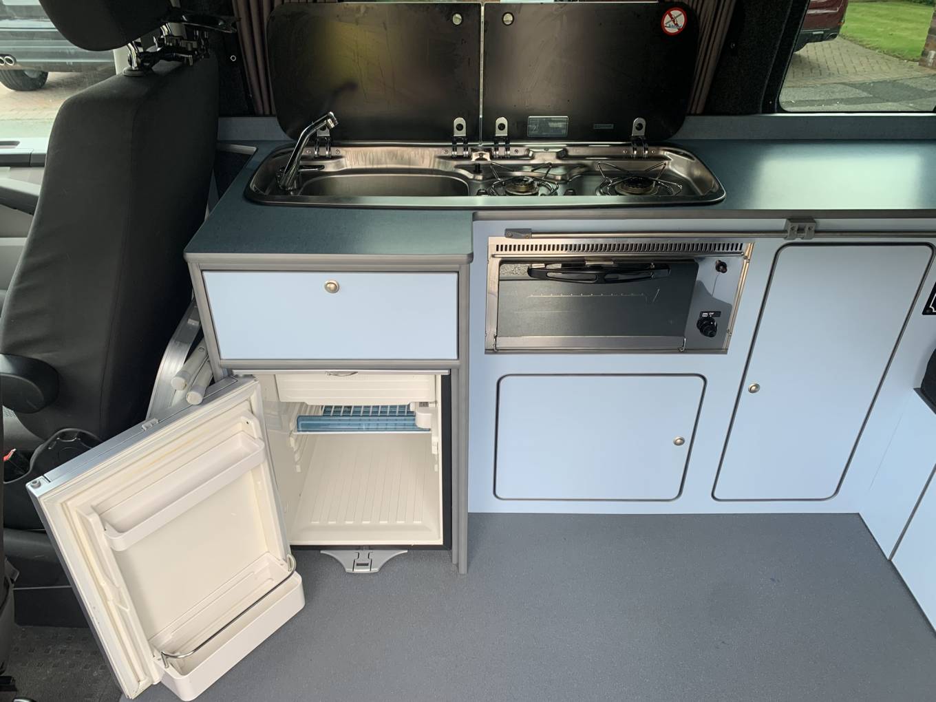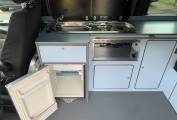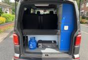 The centre dinette includes a 2 ring gas hob supplied by the gas bottle located underneath in the cupboard. There is also a sink and a good sized fridge with freezer compartment and a dining table which is well positioned between all 4 travelling seats. In this area is also a diesel heater which is controlled by the interface positioned on the unit just right of the hob and doesnt need the engine running to function. At the rear of the camper there is a external shower point which is perfect for cleaning dirty boots, bikes or pets.