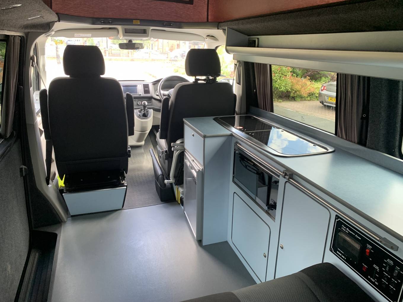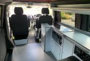 This high level quality conversion offers a 4 berth sleeping capacity along with 4 travelling seats. The cab which boasts 2 of the travelling seats also has the passenger swivel chair that can be turned around to face the centre dinette and the remaining 2 travelling seats. In the Cab there is a touch screen interface which includes dab radio, bluetooth phone, air conditioning and heated windscreen along with electric windows and mirrors