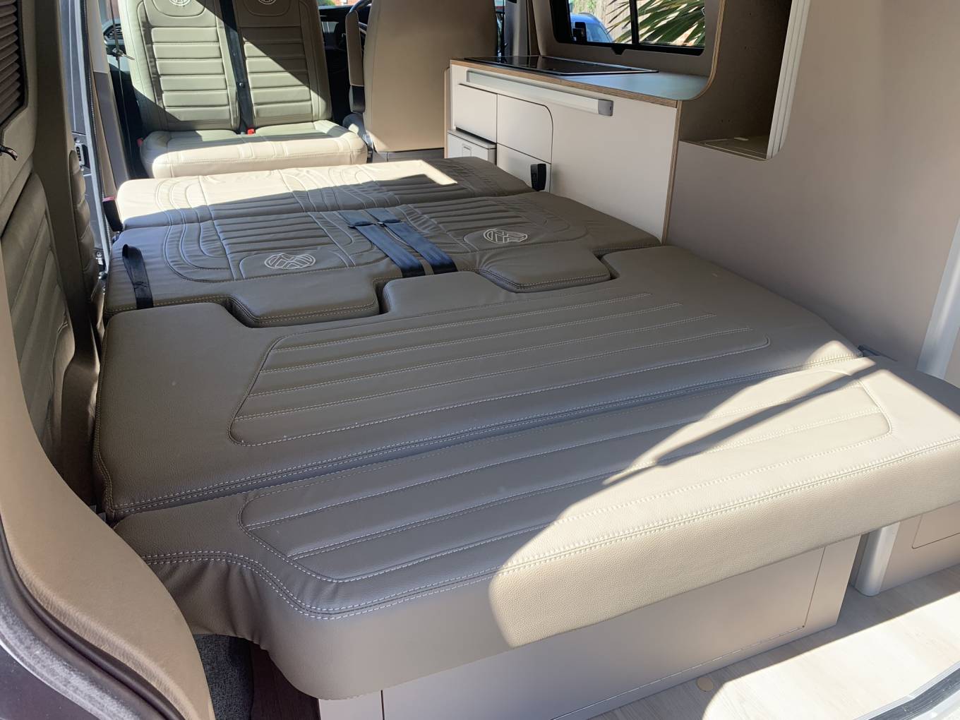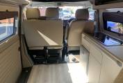 This high level quality conversion with the most stunning caramel leather upholstery offers a 4 berth sleeping capacity along with 5 travelling seats. The cab which boasts 3 of the 5 travelling seats also has the passenger swivel chairs that can be turned around to face the centre dinette and the remaining 2 travelling seats. In the Cab there is a touch screen interface which includes apple car play, dab radio, bluetooth and air conditioning. There is also a heated front windscreen which is ideal for the winter frosty mornings.