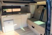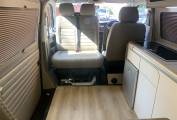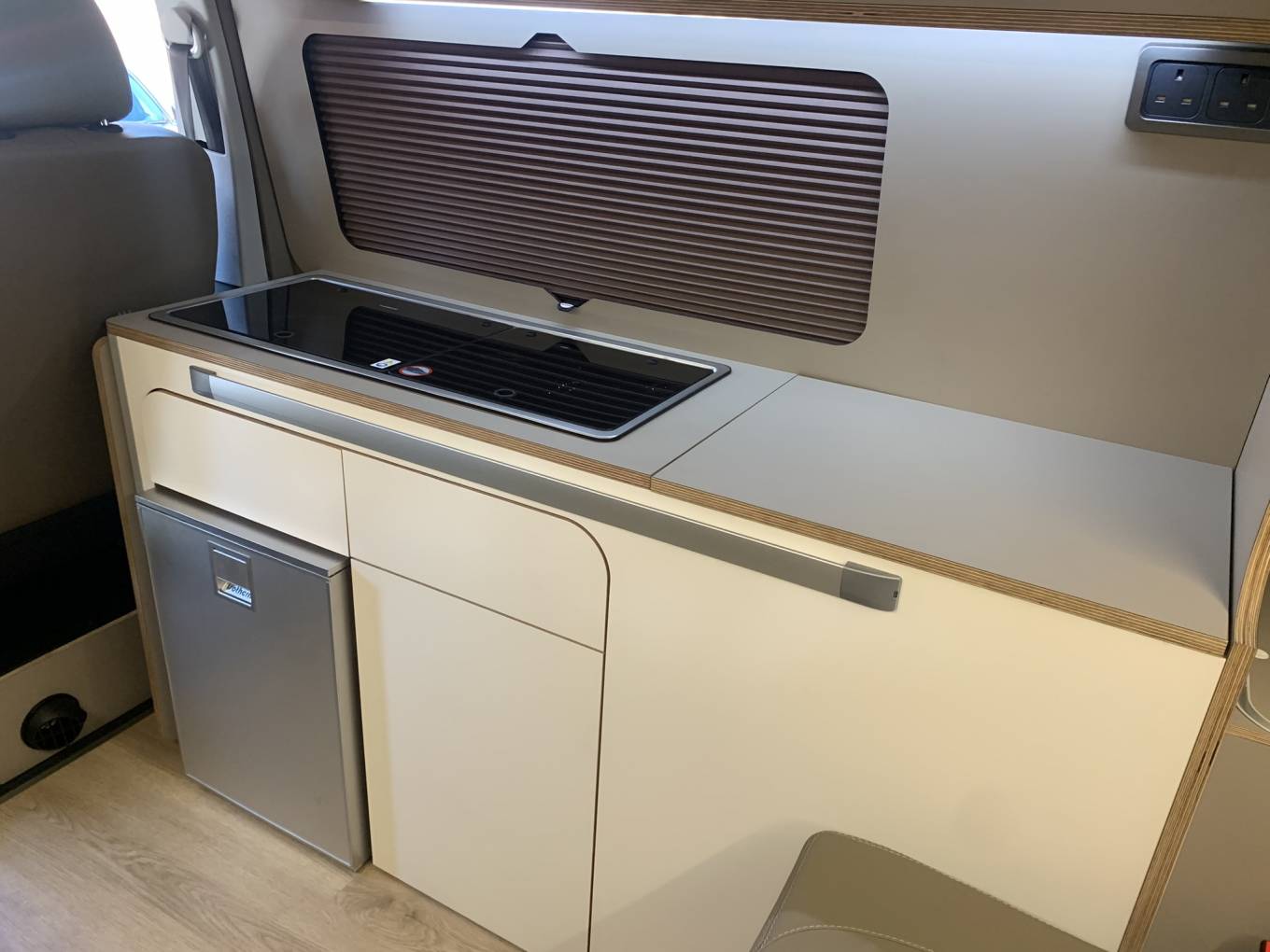 The centre dinette includes 2 ring gas hob supplied by the gas bottle located at the rear of the camper in the cupboard. There is also a sink and a good sized fridge with freezer compartment. In this area, there is a removable dining table which is positioned between the 4 travelling seats.