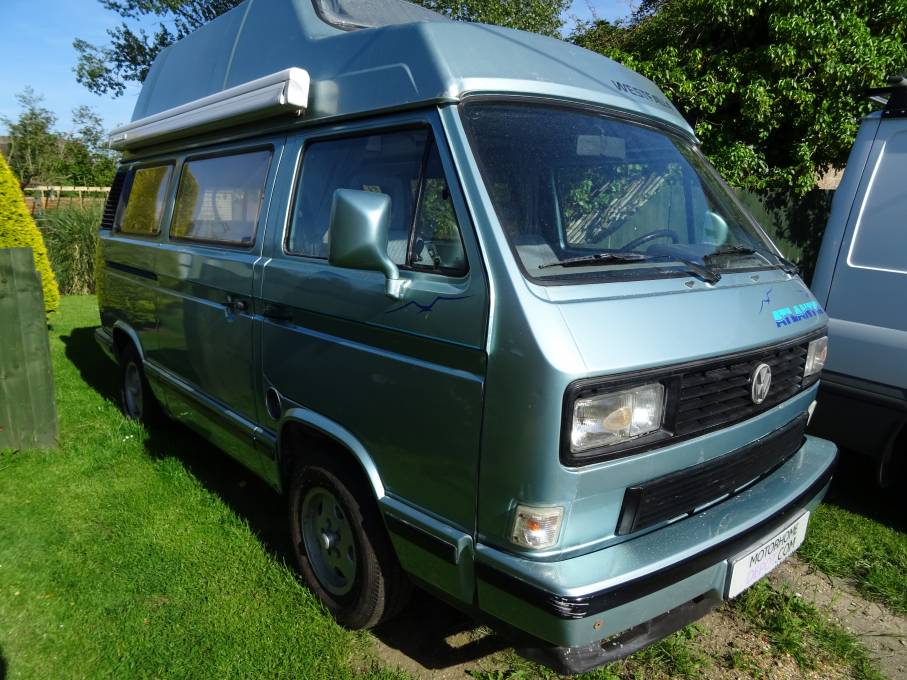 Motorhome Depot are please to offer this 1990 Volkswagen Westfalia Atlantic T3-T25, with 4 berths & 5 seatbelts finished in "Atlantic Green". This left hand drive high top camper van is full of character and is a great introduction to Classic camper vans. It has got everything you need for a great holiday or turning heads at the beach.