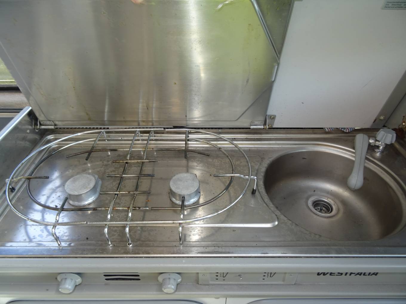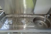 slide out double bed in the roof area. The kitchen features a sink, gas hob