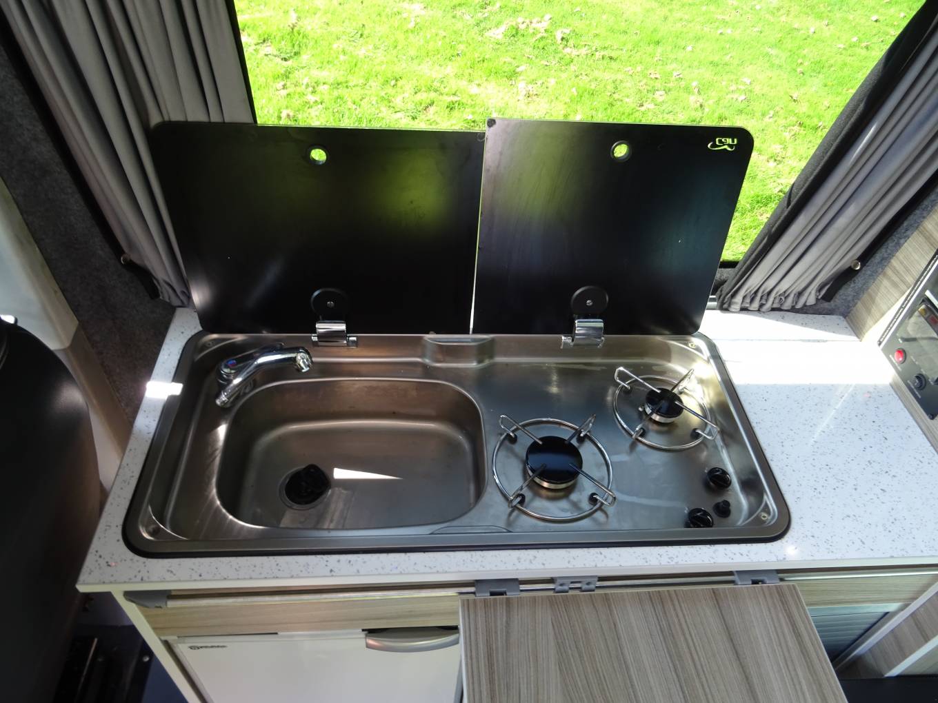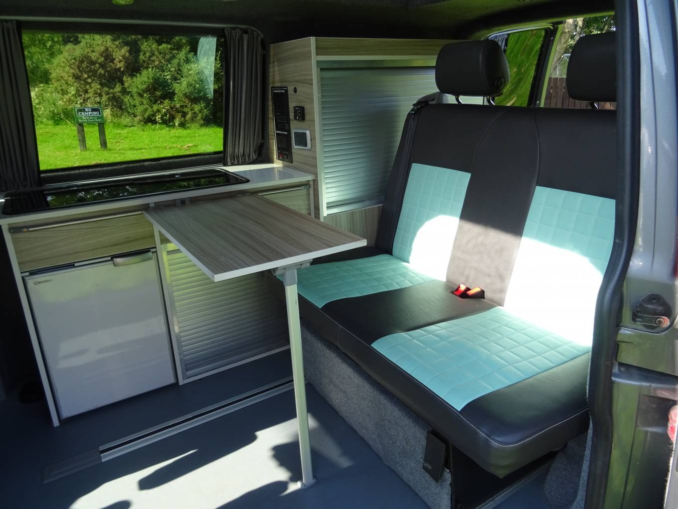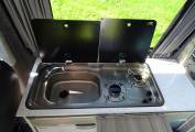 The side kitchen area has a fridge with ice box, 2 burner hob and a sink with hot and cold water. Internally, there is ceiling mounted RGB mood lighting, storage, Erbspacher diesel heating and a drop down DVD/TV. There is plenty of storage for a vehicle of this size including 2 lockable safes under the front seats, a large sliding drawer under the rear seat and a large cupboard with shelf above. The sliding table completes the interior to ensure you have all the home from home facilities you need for a holiday or weekend break, or just a sneaky night away from the kids!