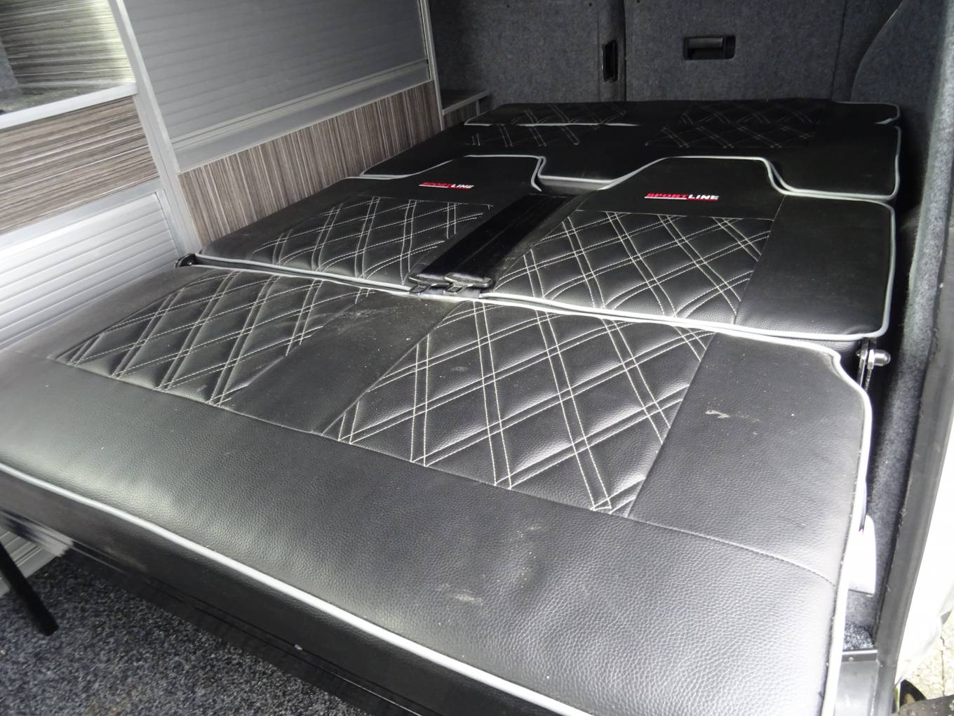 Internally, the black cross stitched seating looks very smart, having 5 seat belts making it a daily drive option. The rear seats have a very quick and simple mechanism to turn it into a double bed and also have storage underneath. The front double passenger seat also swivels round if required. The camper van benefits from the well designed and typical side kitchen, consisting of a fridge, 2 burner hob and sink with cold water and storage underneath, there is also a reasonable sized wardrobe to the rear of the vehicle.