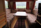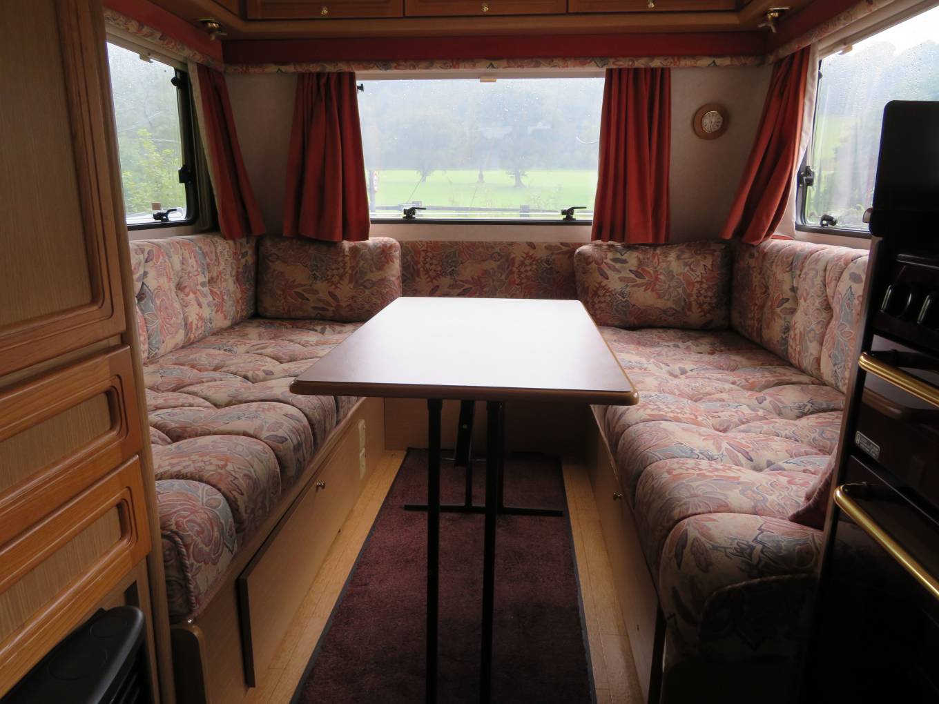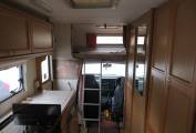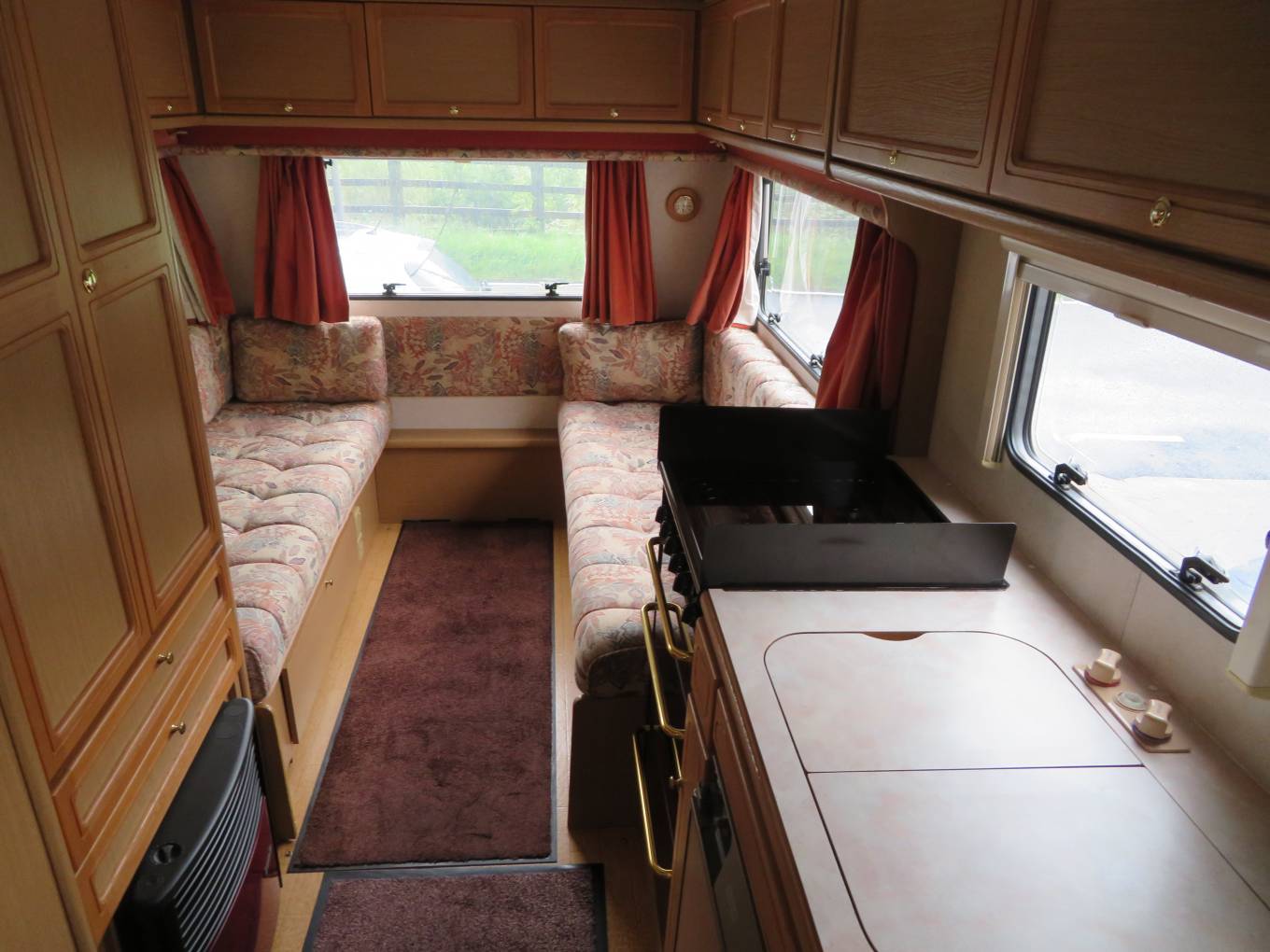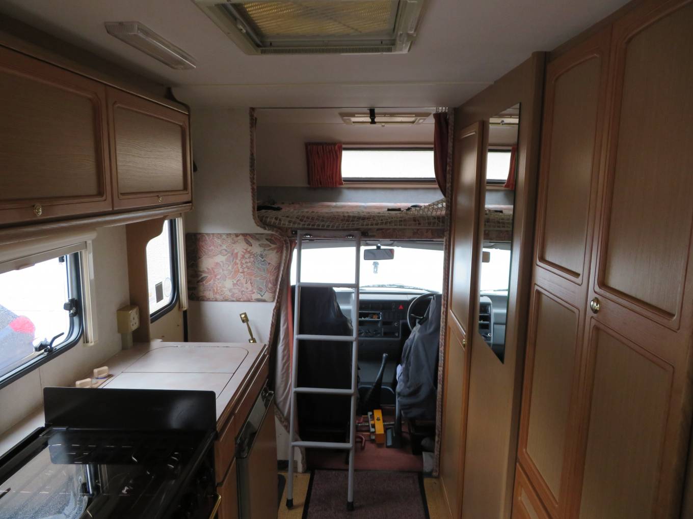 On entering the vehicle through the Habitation door you have the washroom in front of you with a Thetford toilet, a lift up wash hand basin and a shower, which also has a window and a small sliding mirrored cupboard. To the side of the washroom is the large wardrobe with clothes rail, aerial for a TV and the centre dinning table is stored to the one side, beneath this there are 2no sliding draws and the Trumatic heater. Opposite this is the kitchen area with a full size oven, grill and a separate 4 burner hob, there is a tall narrow cupboard which divides the fridge from the oven, the fridge has a small freezer section to the top, above this is the sink which has a cover that folds out to create extra work space. To the rear is the large U shaped lounge which converts to a large double bed, all windows have fly screen/blinds and curtains, there are 11no top storage cupboards above the seating area and storage under the seats. Above the Cab there is a large double bed with a small window accessed from a ladder. The original carpets have been kept and will come with the vehicle.