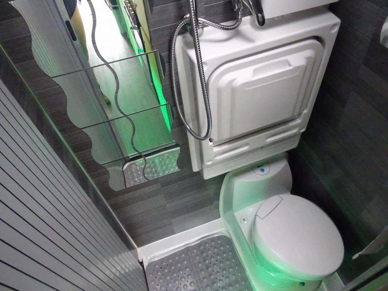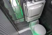 shower, toilet and drop-down sink housed behind a neat tambour door. This room is ventilated by way of a roof