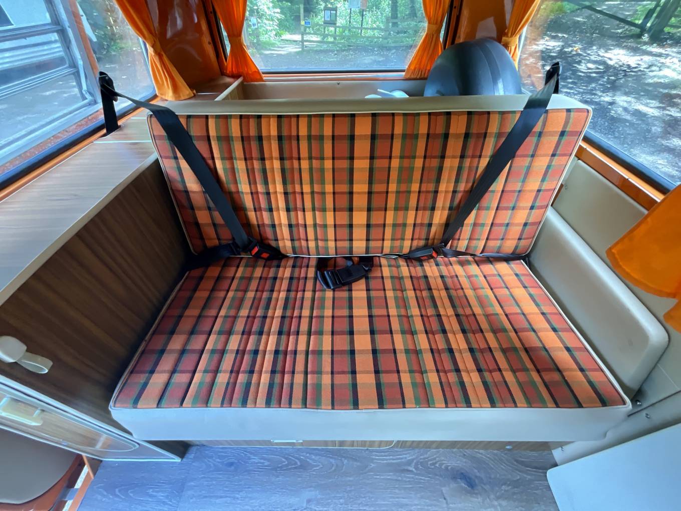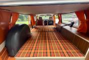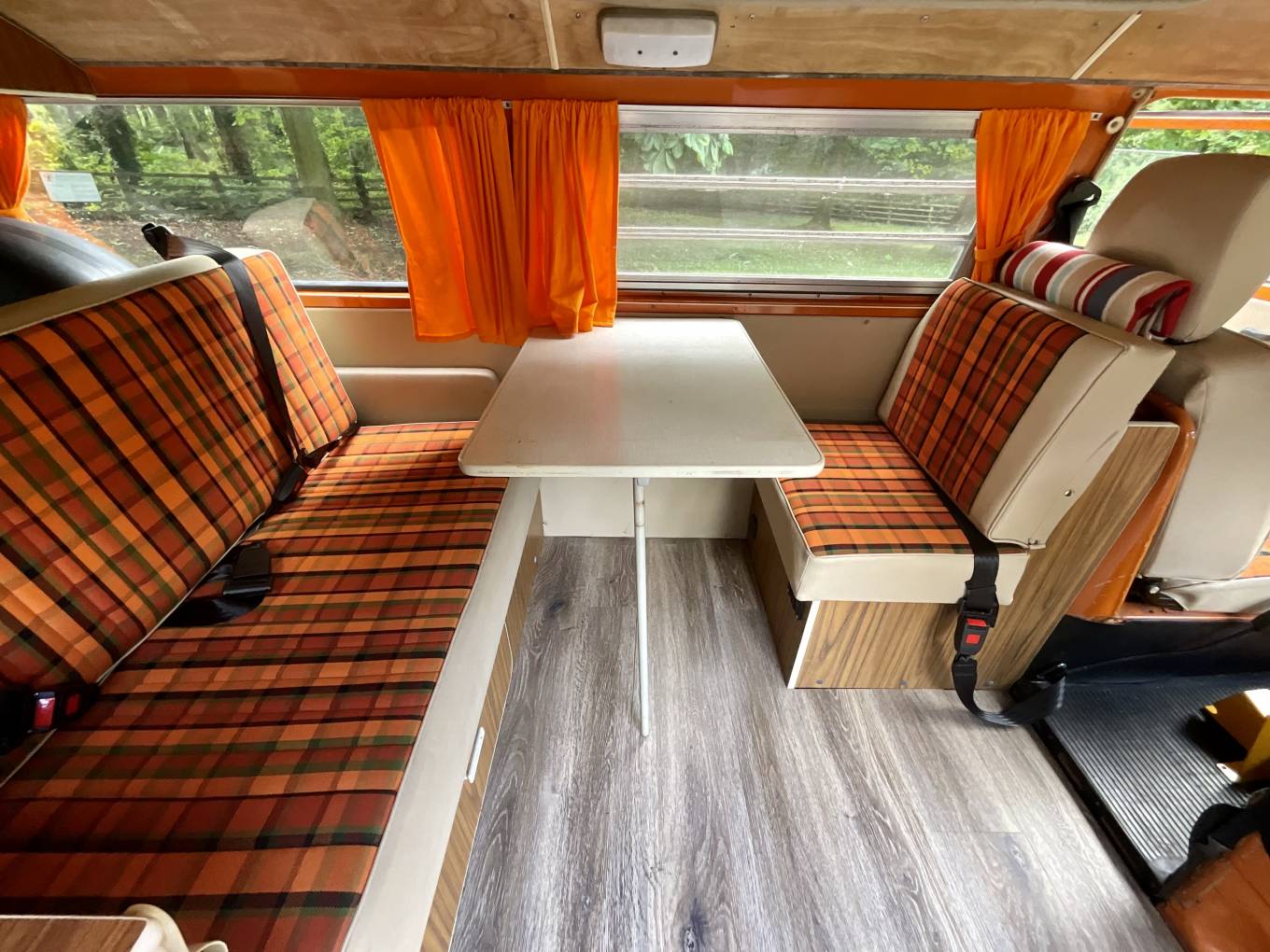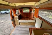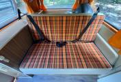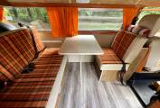 This four berth conversion comes with an easy to use rock 'n' roll bed and canvas pop top to sleep in, and to increase room to move inside the camper whilst camping. The lounge features a stylish Westfalia plaid on the seating of the bench seat, and rear facing lounge seat. For socialising and meal times, a table folds out. Wood effect flooring matches the style of the storage units.