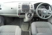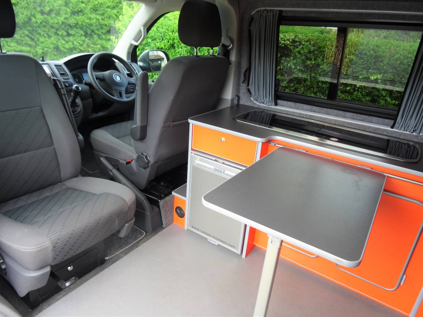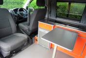 The kitchen has a 2 gas burner hob, stainless steel sink with tap, 12v Dometic fridge. We have good storage below and throughout (also under seat) and the passenger seat easily swivels. The twin belted rear seating has positional ratchet settings giving us the options preferred in a Long Wheel Base van. For their own needs, the owners have wisely opted for a ply-wall to give a dedicated storage area at the rear. This can easily be removed if deemed necessary.