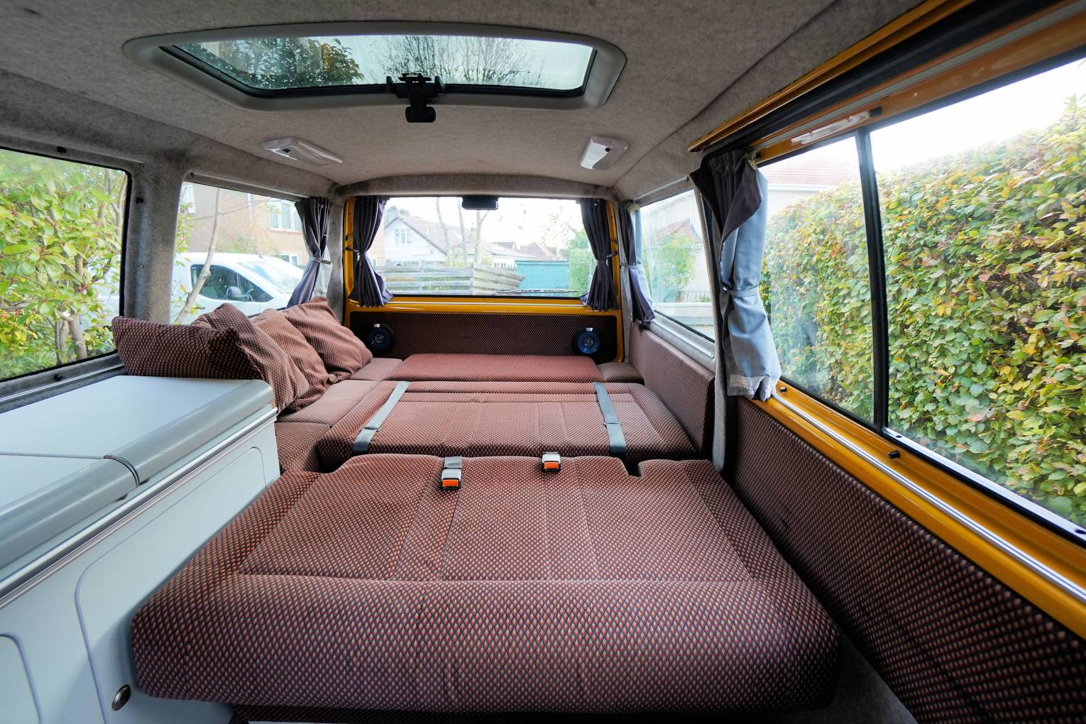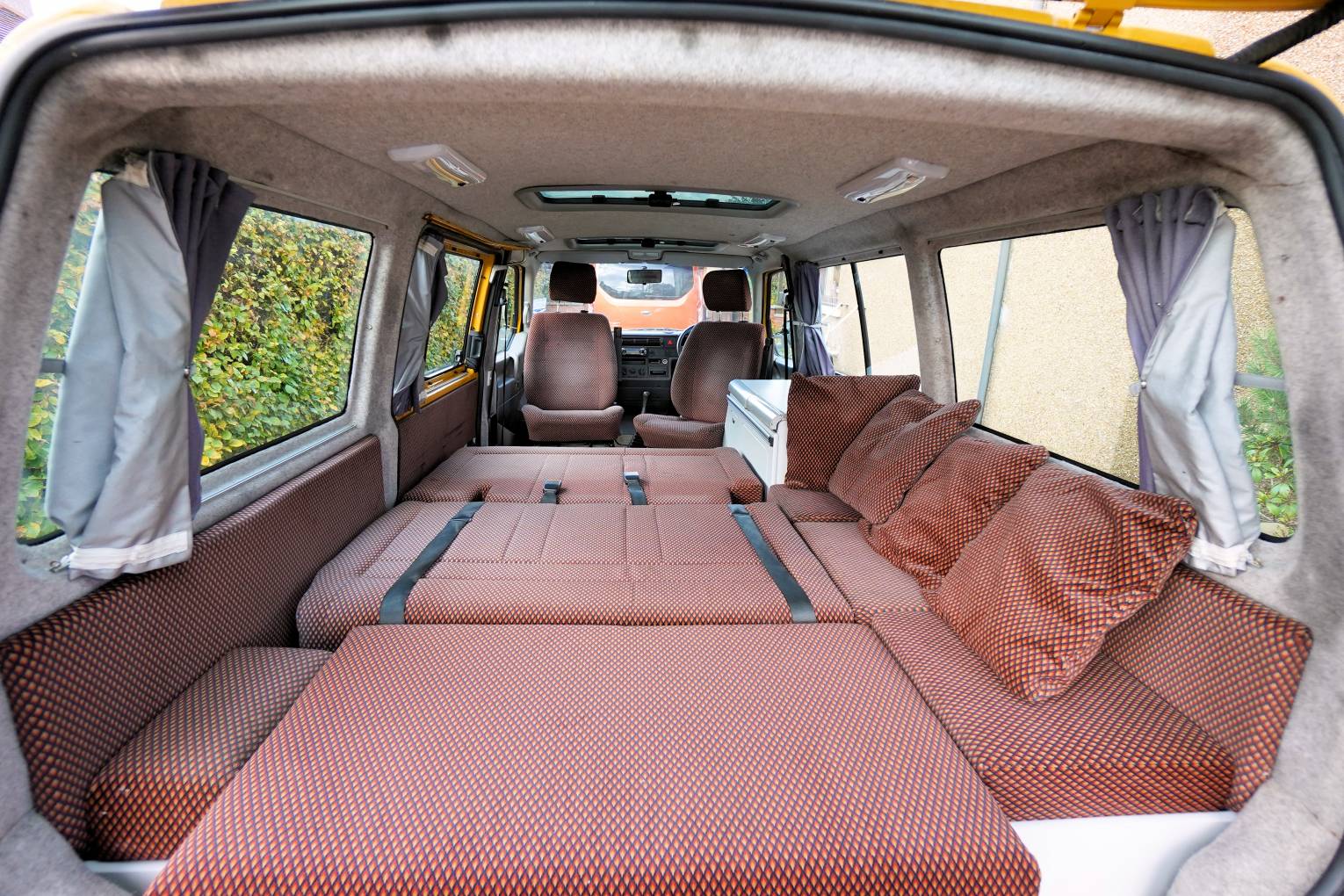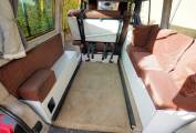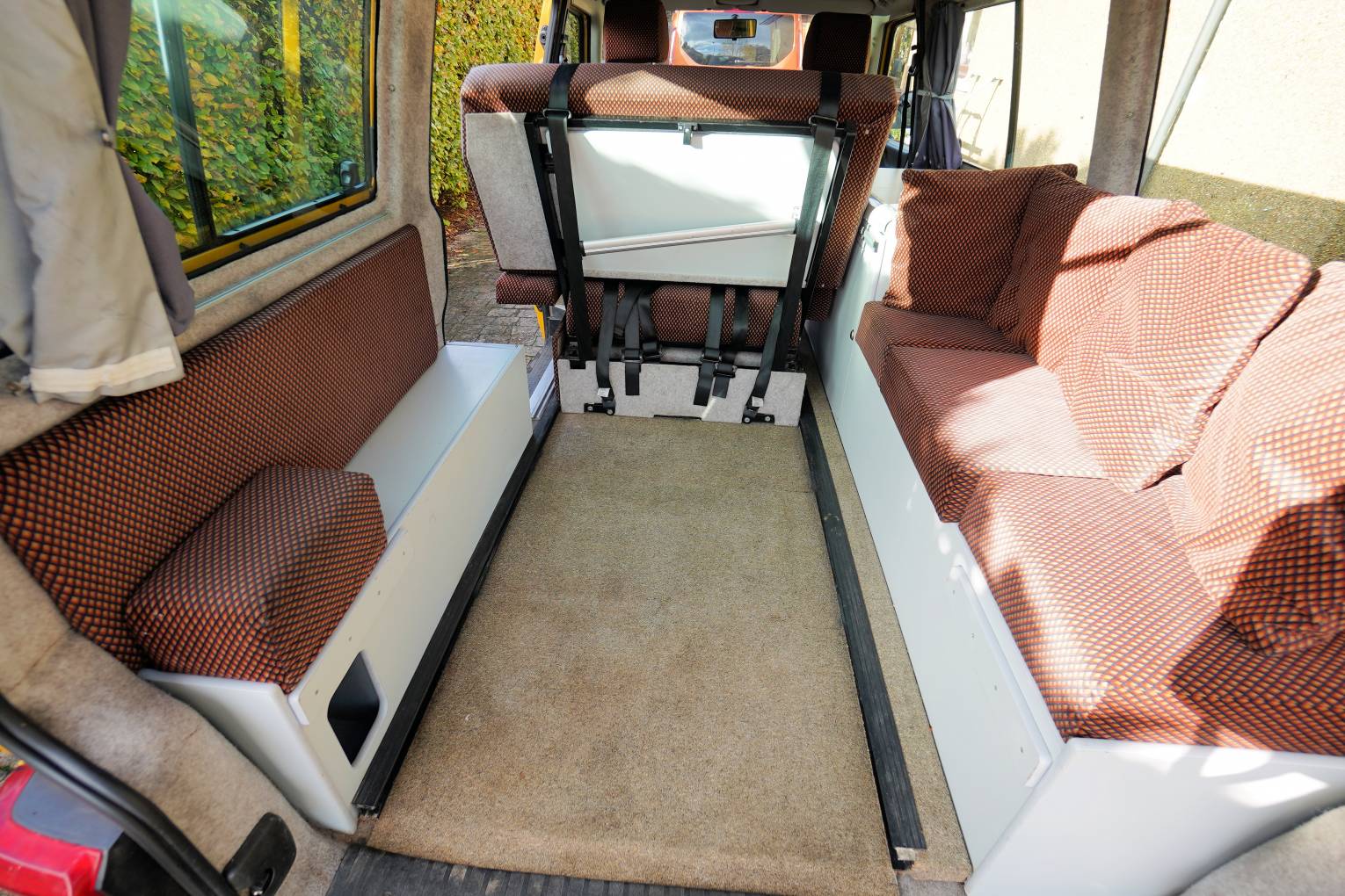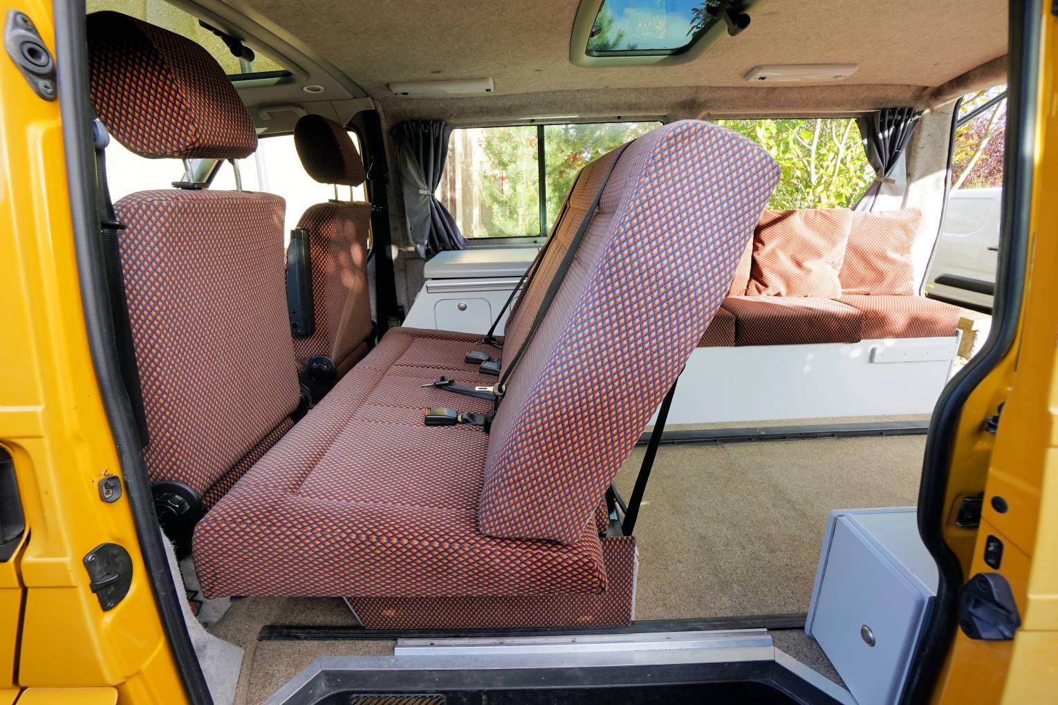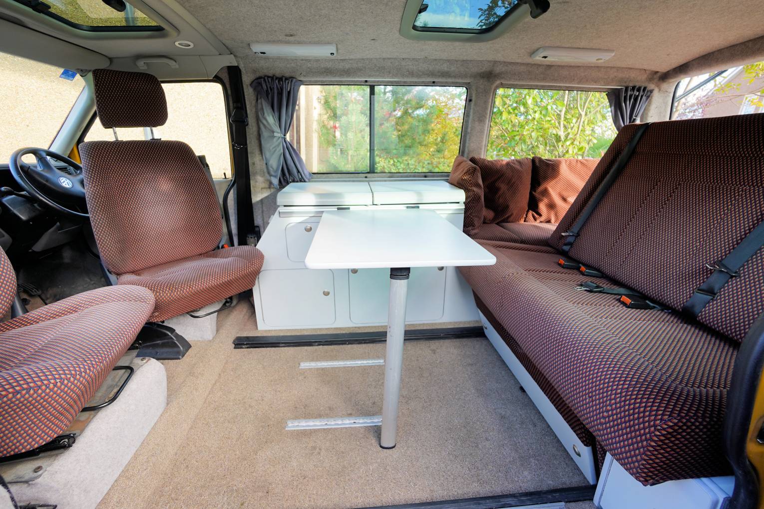 Step inside this campervan and this is where it gets interesting. Both single front seats swivel and the rear bench seat with 3 seatbelts converts into a lovely large double bed. It is also possible to move the bench seat all the way forward to allow plenty of room to get masses of luggage or full-size bikes in the rear. Or push it back to leave a lovely large area for dining and lounging using the stow-away table that clips onto the rail by the hob. This really is a clever design and so adaptable for a number of scenarios. On top of this, it is also adapted for wheelchair use with access ramps and tracks for securing the wheelchair whilst on the move. Unfortunately, the securing clamps have been misplaced but I am sure they will be readily available if required. The fixed low-line roof has two skylights fitted that fill the interior with light. The solid cupboard unit finished in white has a twin gas hob, sink with cold running water supplied from the onboard tank and a porta-potti located in the bottom cupboard. There are black-out curtains to the side windows and an interior thermal screen for the front. The interior upholstery is in lovely clean condition and ready for many more years of travel. Also included in the sale is a 3-bike cycle rack, gas bottle and electric hook-up cable.