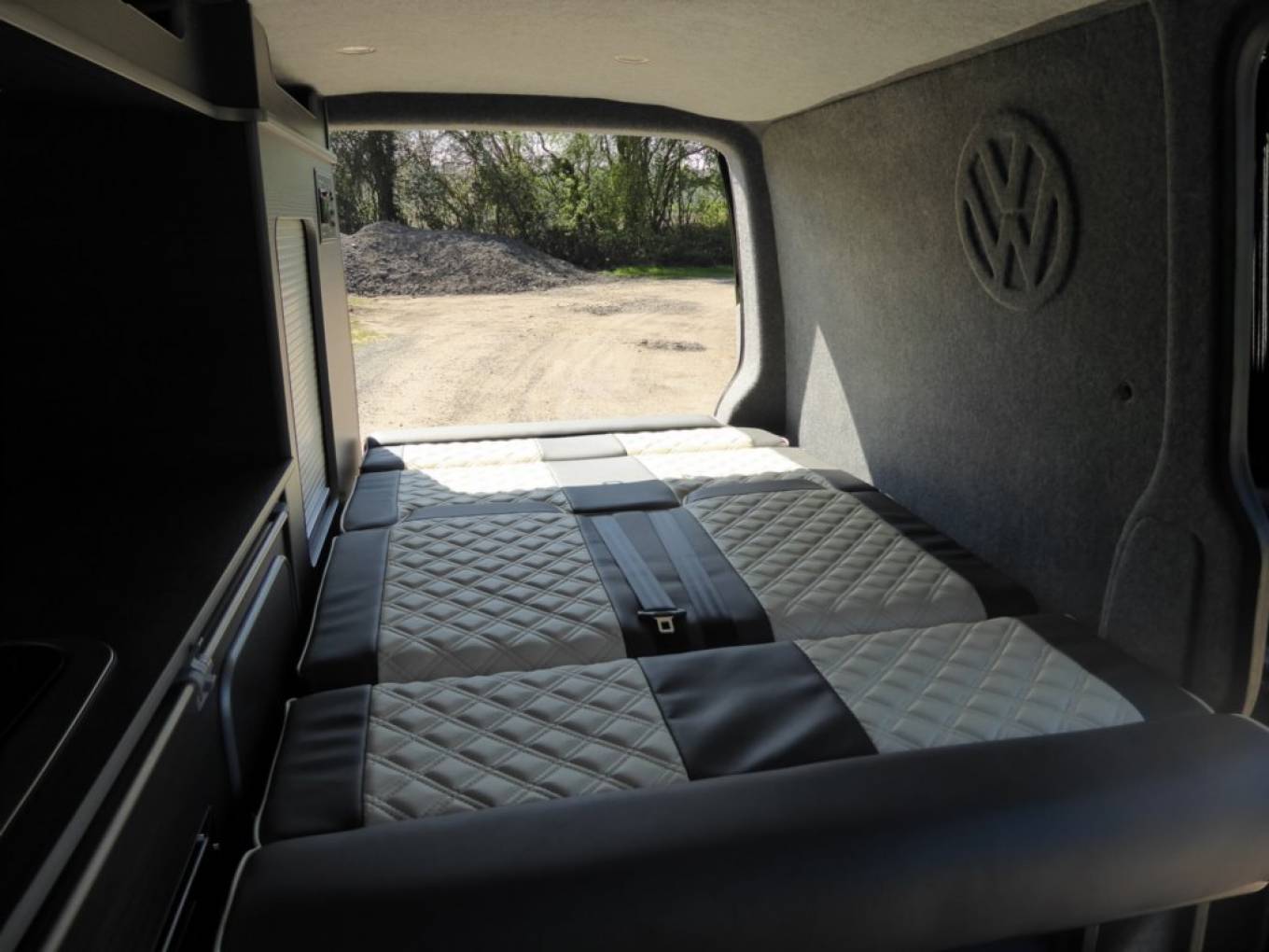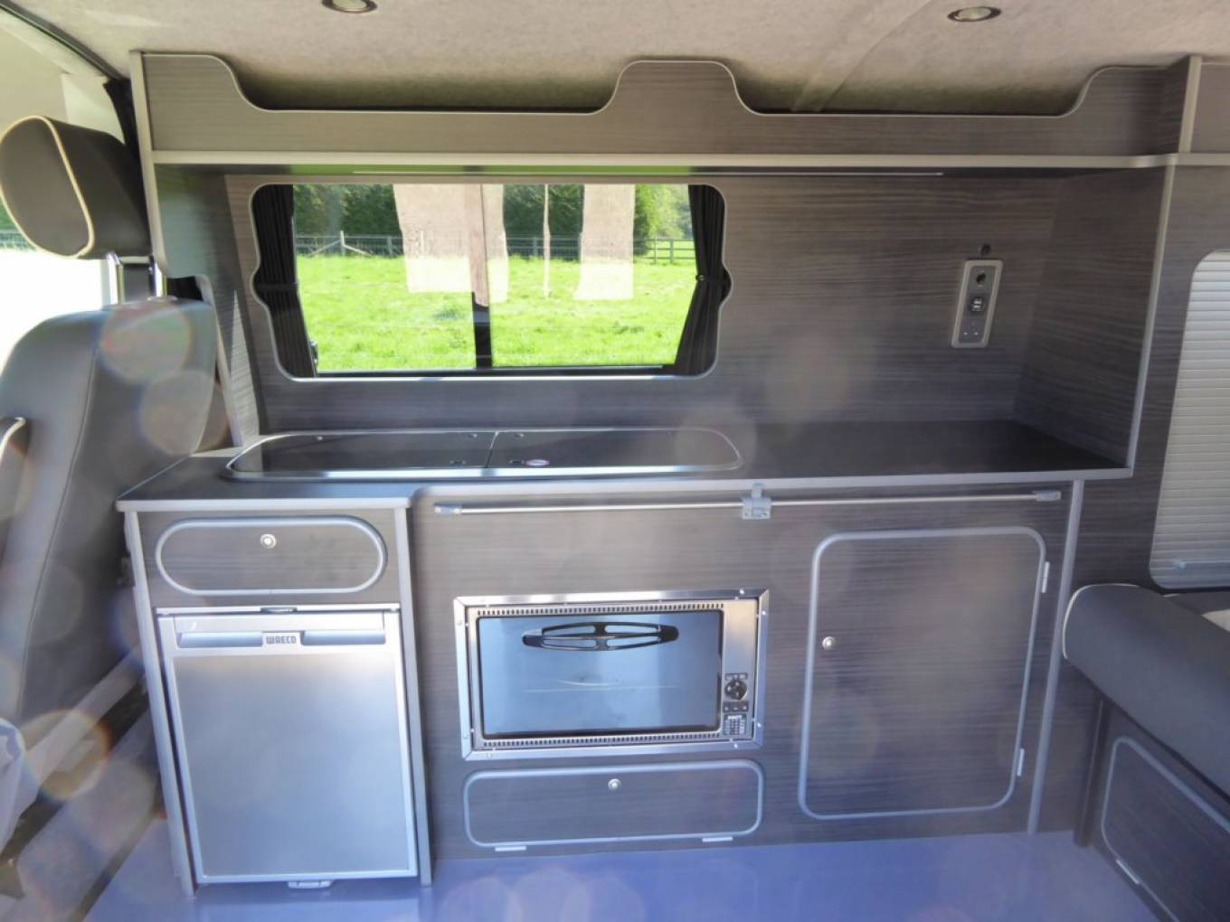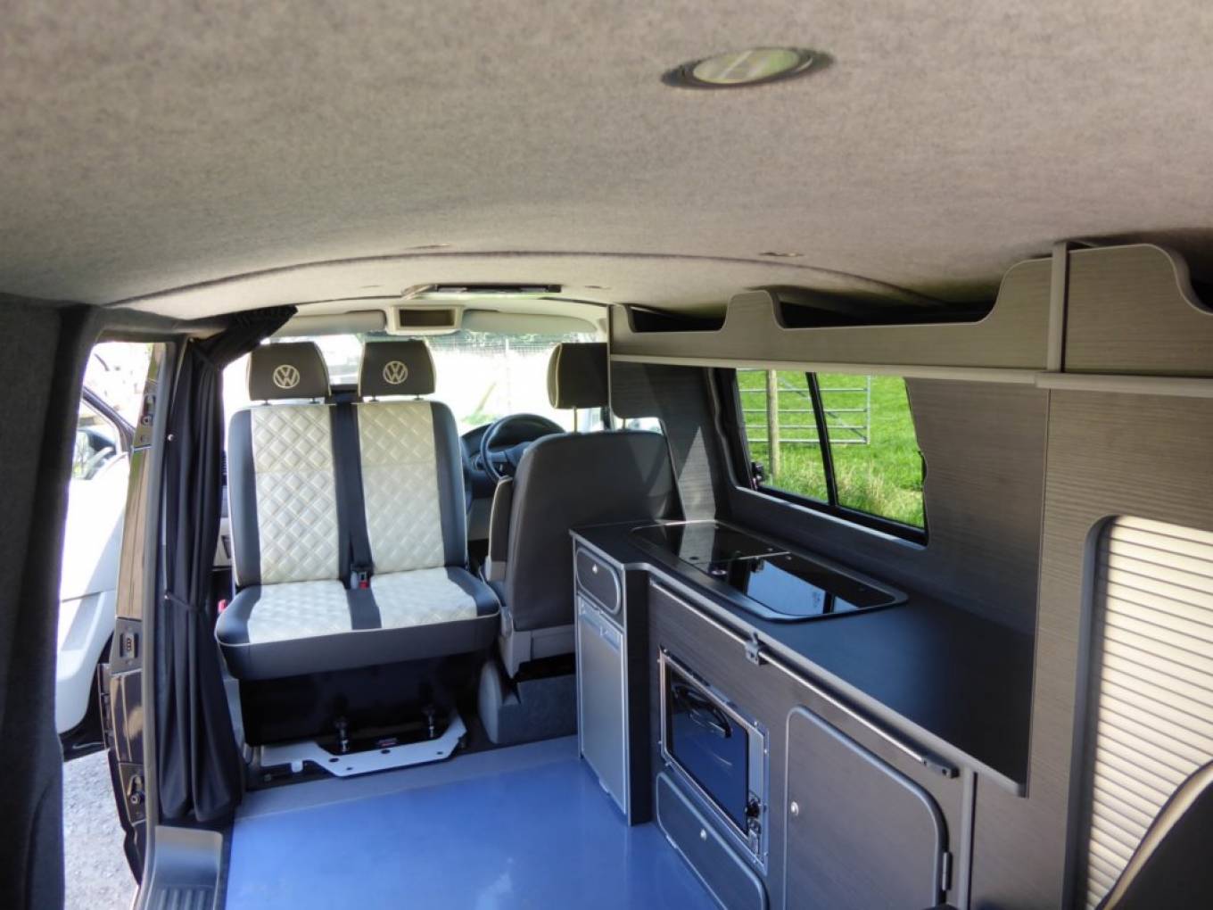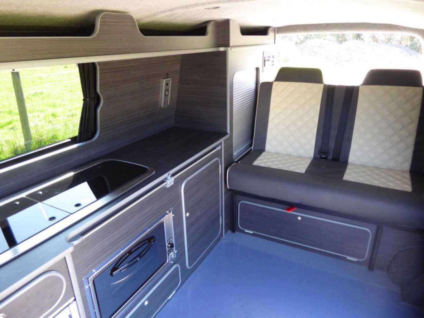 The camper side is stunning with a VW Embedded leather flip front crew cab seats with VW stickers. The driver seat is the same with the rock and roll bed in a similar style to match, the vehicle unlike most boasts a Smev Oven and Grill, a drop down T.V and a VW insignia on one of the internal side insulated walls.