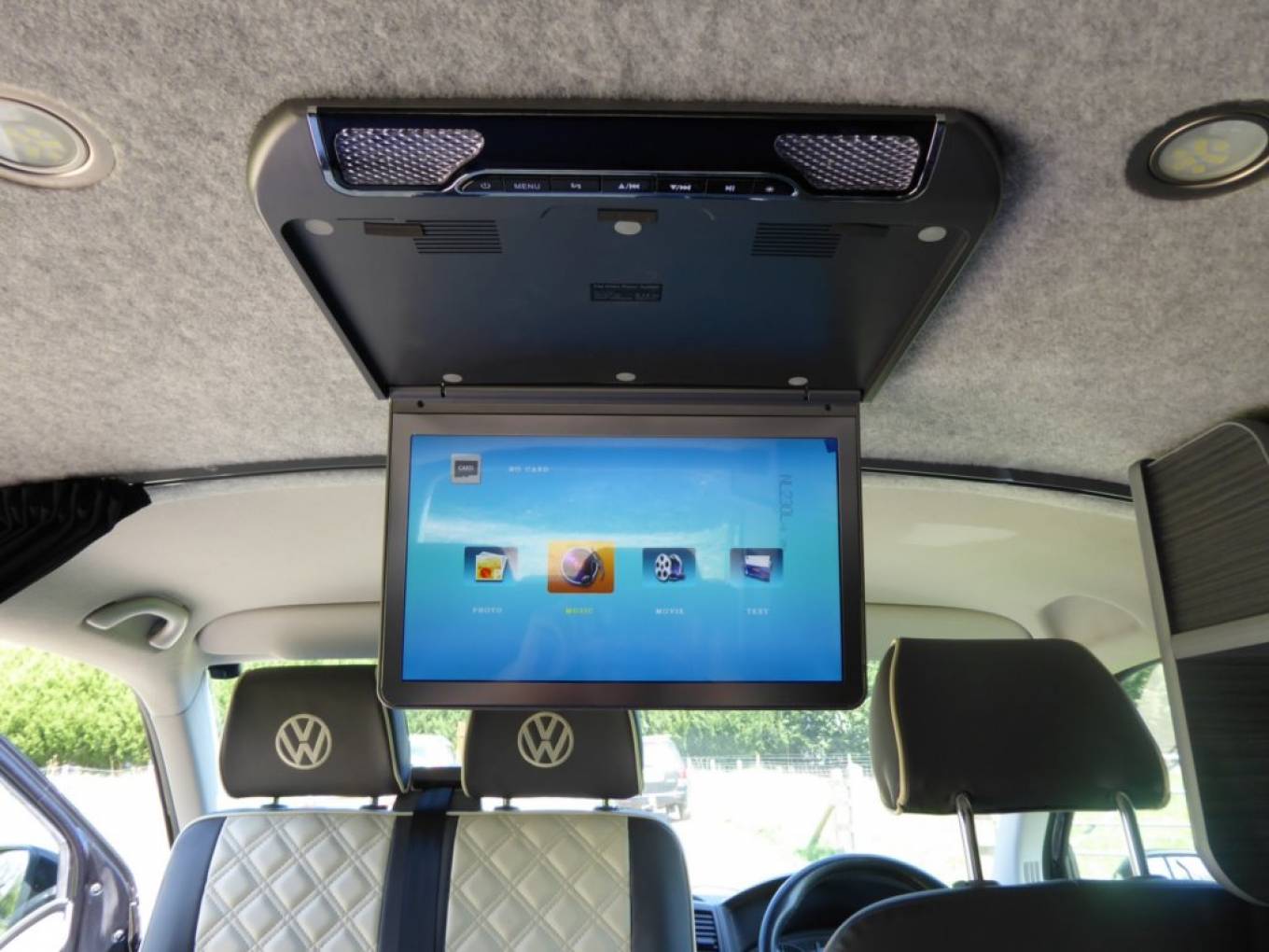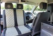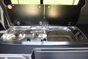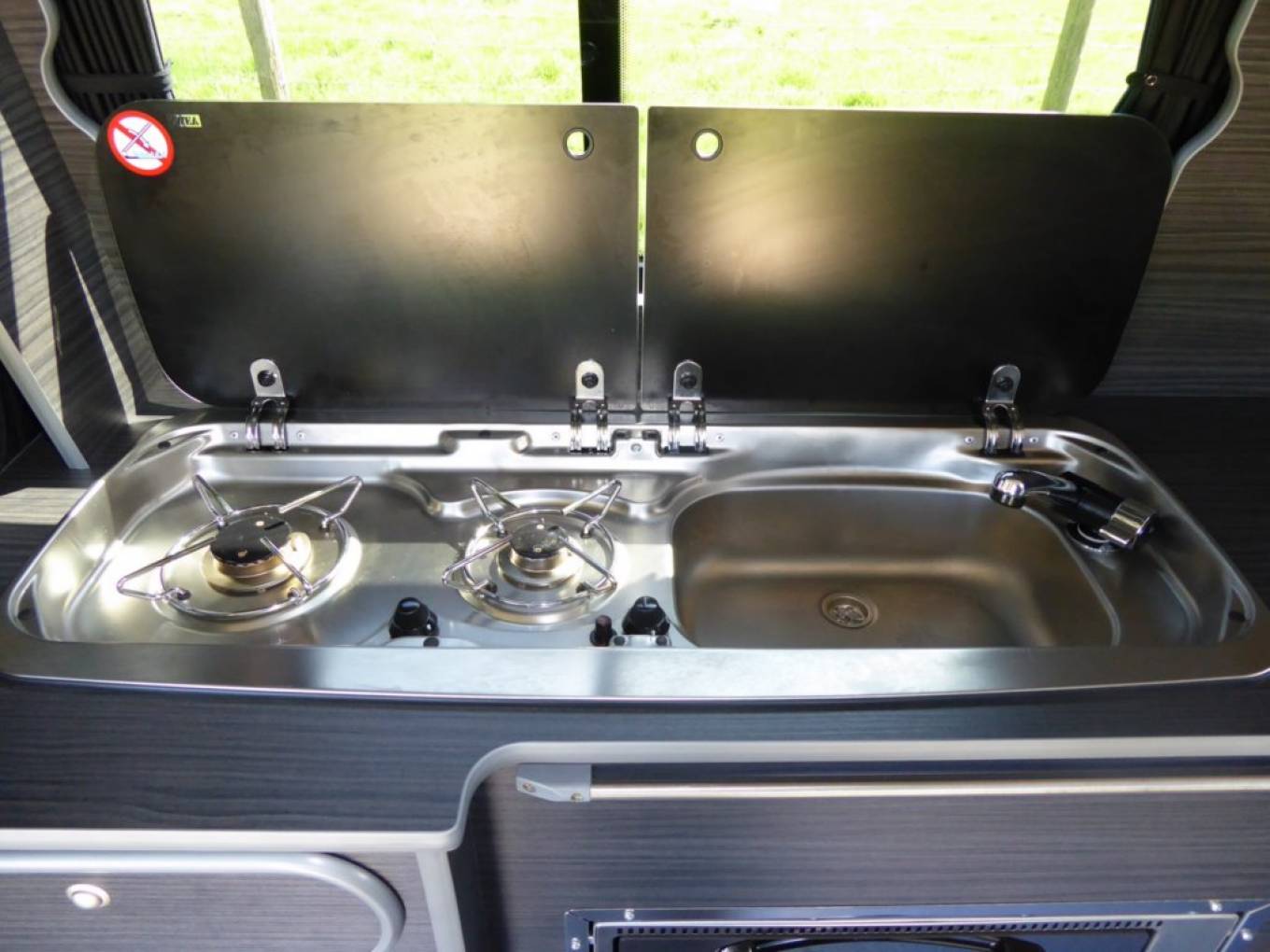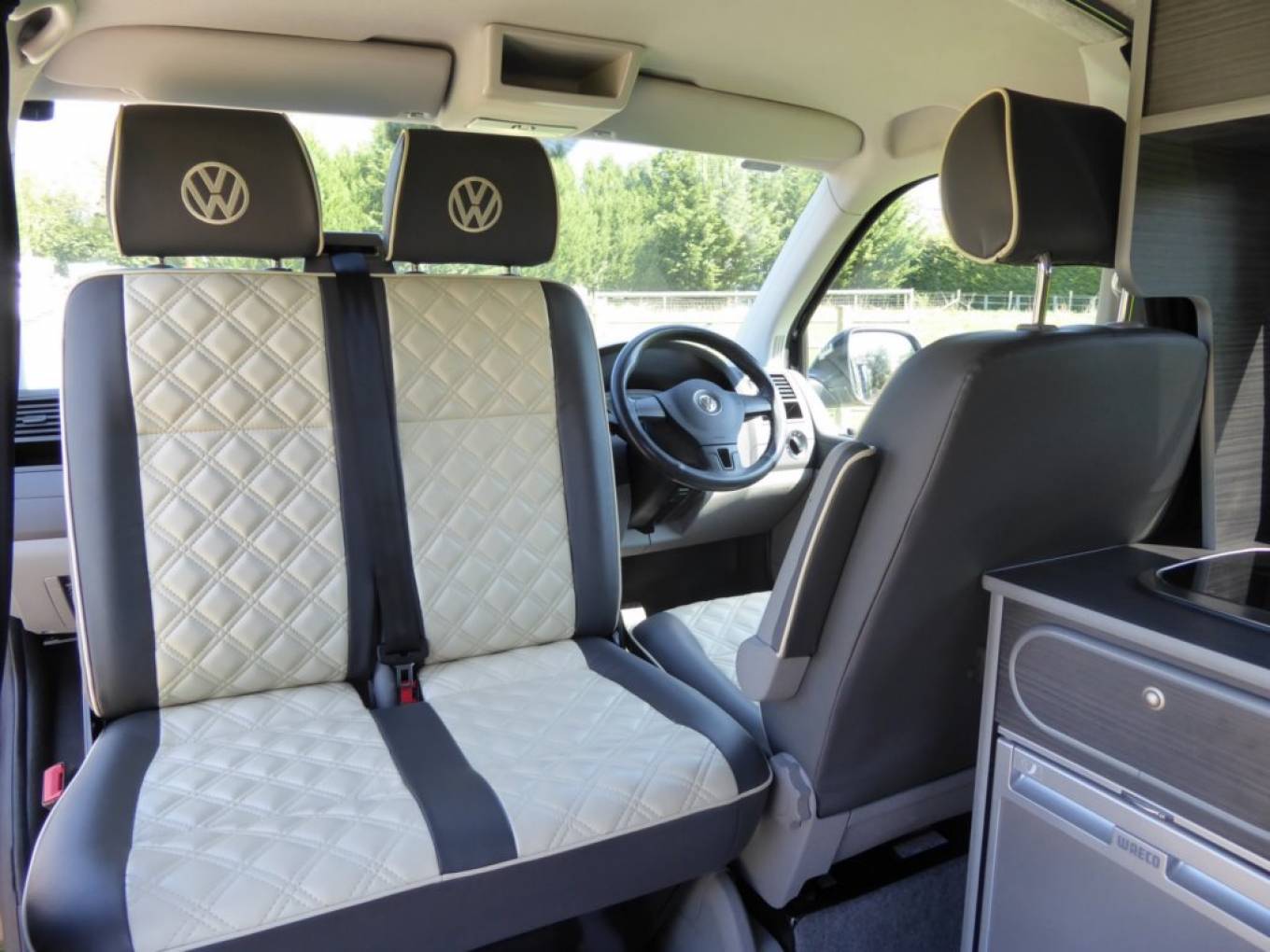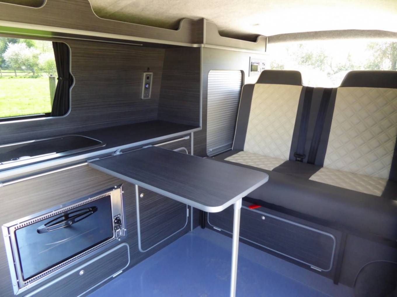 The camper side is stunning with a VW Embedded leather flip front crew cab seats with VW stickers. The driver seat is the same with the rock and roll bed in a similar style to match, the vehicle unlike most boasts a Smev Oven and Grill, a drop down T.V and a VW insignia on one of the internal side insulated walls.