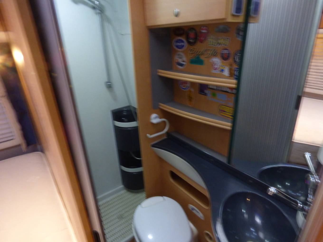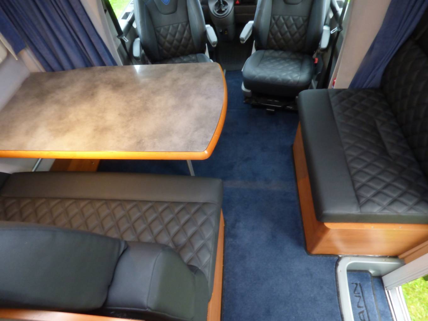 The bodywork is in excellent condition and is furnished with colour coded Borbet alloys and has a full sized spare under the rear of the garage between the manually operated stability legs. From an exterior perspective the vehicle has a recent large wind out awning, external gas bbq point and shower point, Calor gas bottle and also refillable LPG bottle, Vision plus digital aerial and booster, very large garage area, LED lights, 150 watt solar panel with smart charger and stainless steel exhaust. There is also a removeable bike rack which can support up to 120kg in weight. The overall mileage shows 206000 kilometres on the clock which roughly equates to 128,750 miles BUT the engine was fully replaced 62,000 miles ago in 2011.