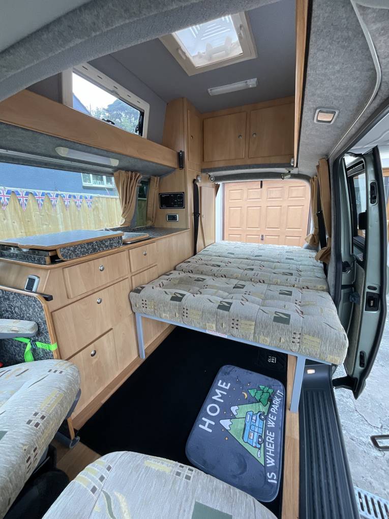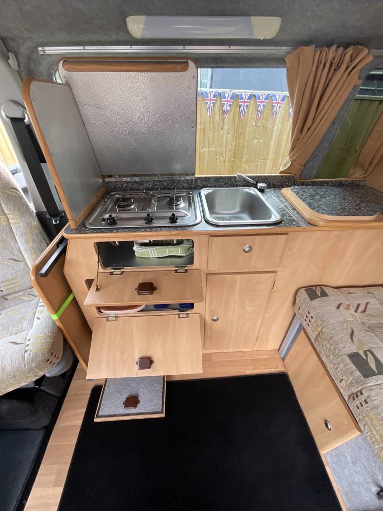 The van has been kept in fantastic condition and as you would expect with a Devon conversion, has a well laid out quality conversion. The van is based on 2010 VW T5, T30, 2.5ltr Diesel engine, covering only 38K miles. There is a rock & Roll bed with very comfortable upholstery and matching twin revolving captains seats. The kitchen area is well equipt with a twin gas hob with grill underneath, a gas cupboard with enough room for two Campingaz bottles (one comes with the van) There is a sink with chopping board cover, cold water tap fed from an on board water tank. A Coolmatic chest style fridge in the counter top with ample storage underneath. As the van is a hi-top there are two windows in the sides and one in the centre of the roof, along with storage cupboards to the front and rear. The vehicle enables you to stand up with the height being 1910mm / 6ft 3" floor to ceiling. Externally the van has a Fiamma wind out awning, external water fill point, electric hook up point, external tv aerial point.