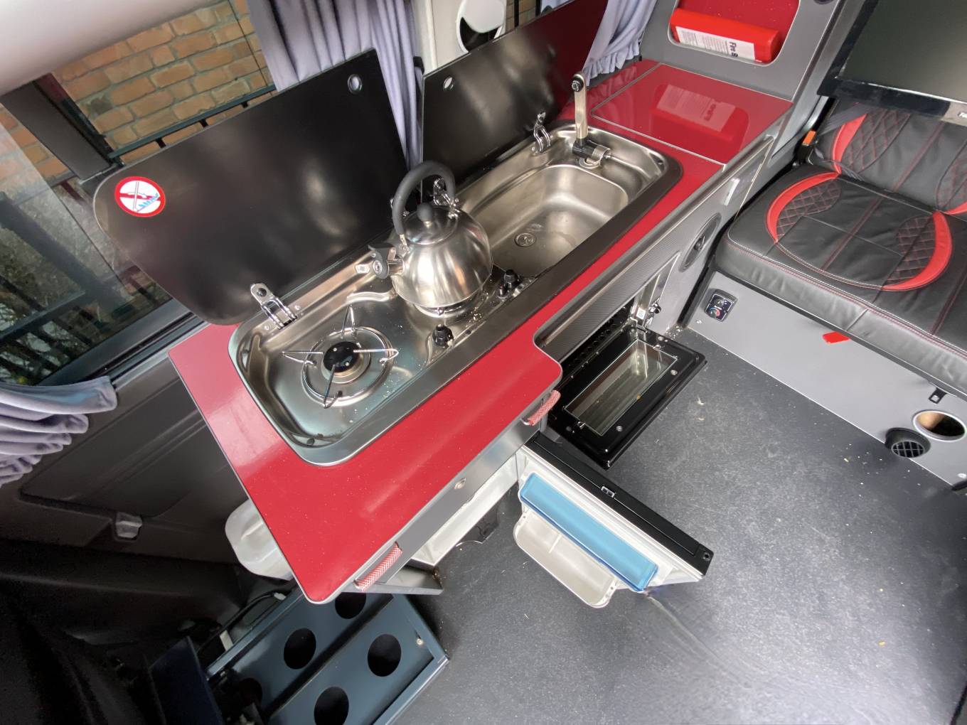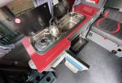 In the kitchen there is a Two Burner Hob, a Smev Oven, a Waeco Fridge, a water container and a Camping Gaz bottle.