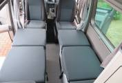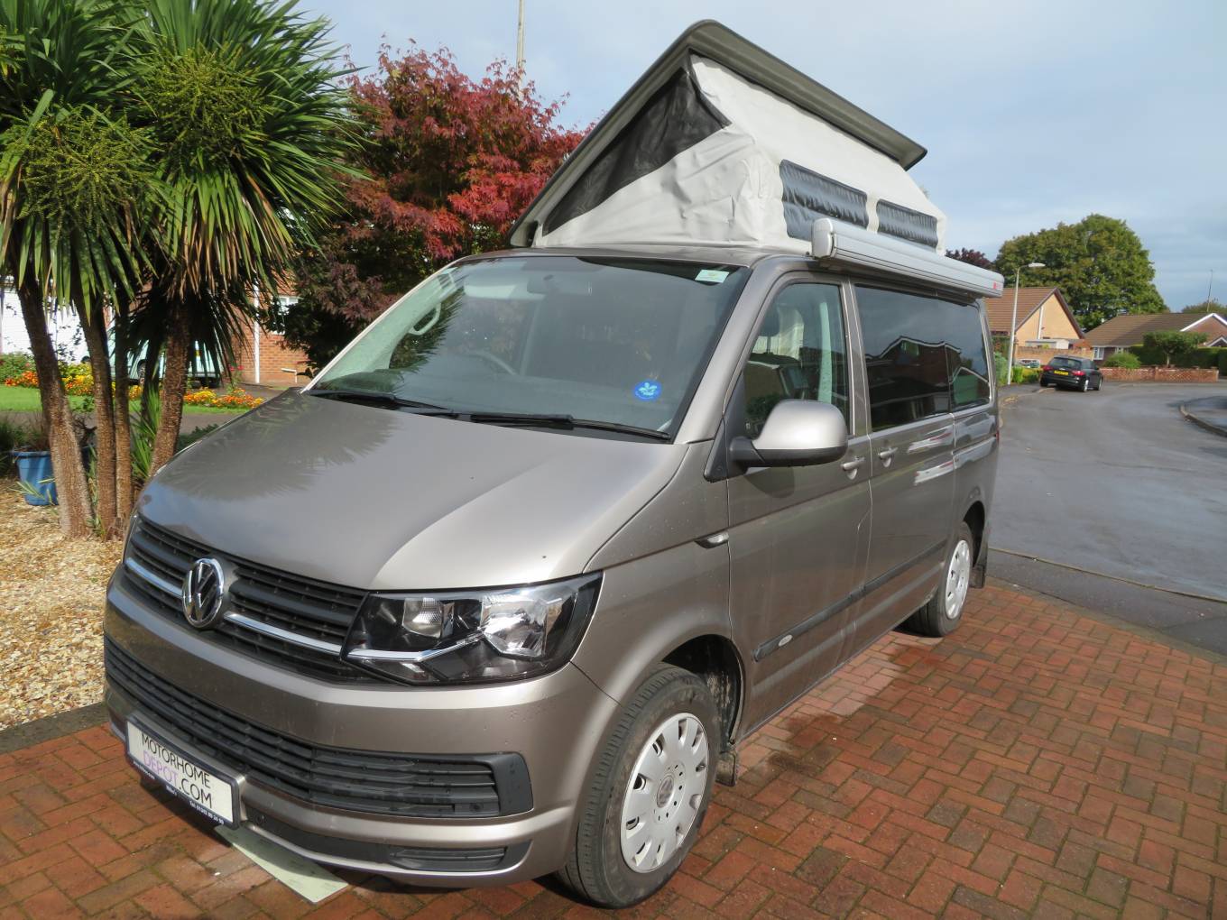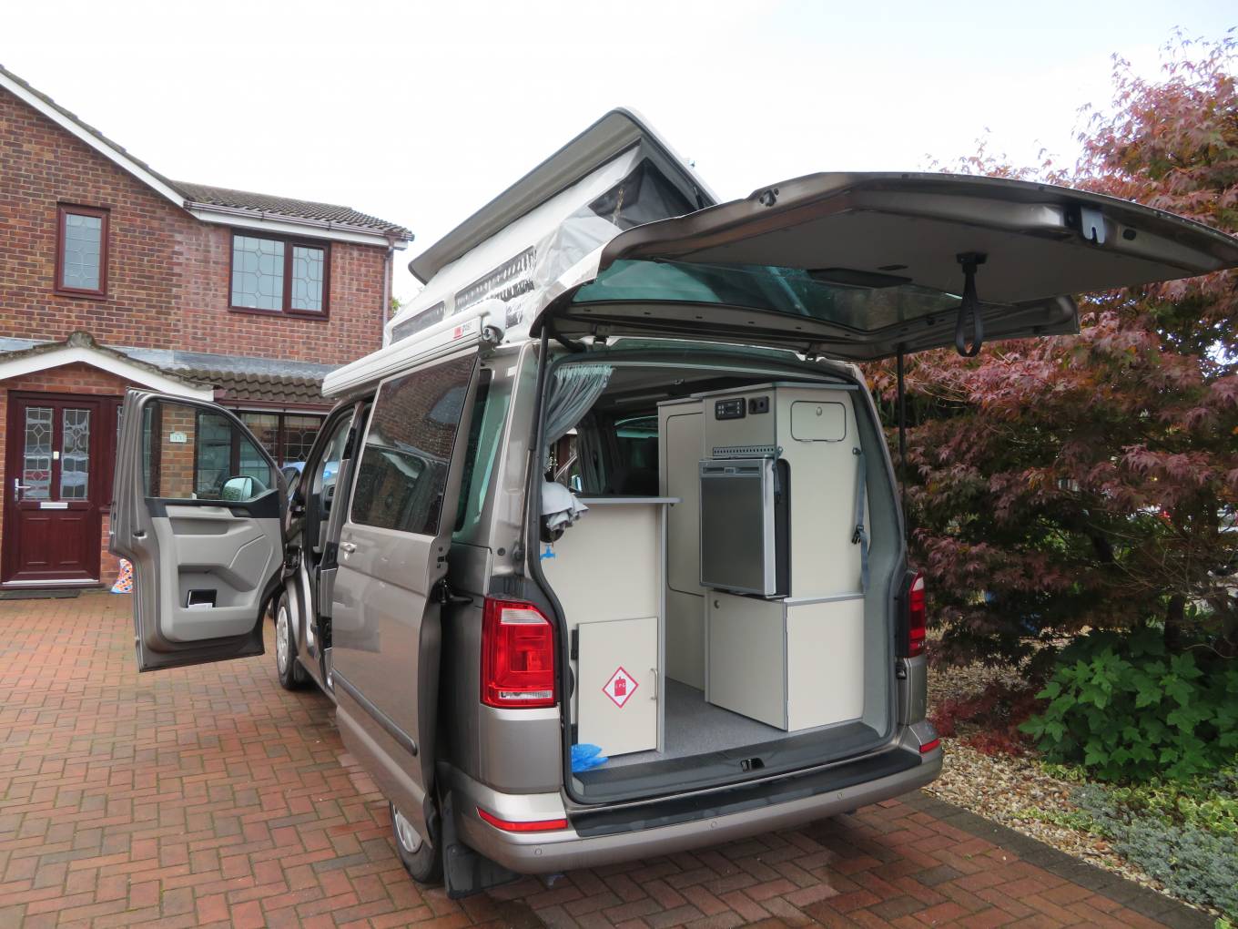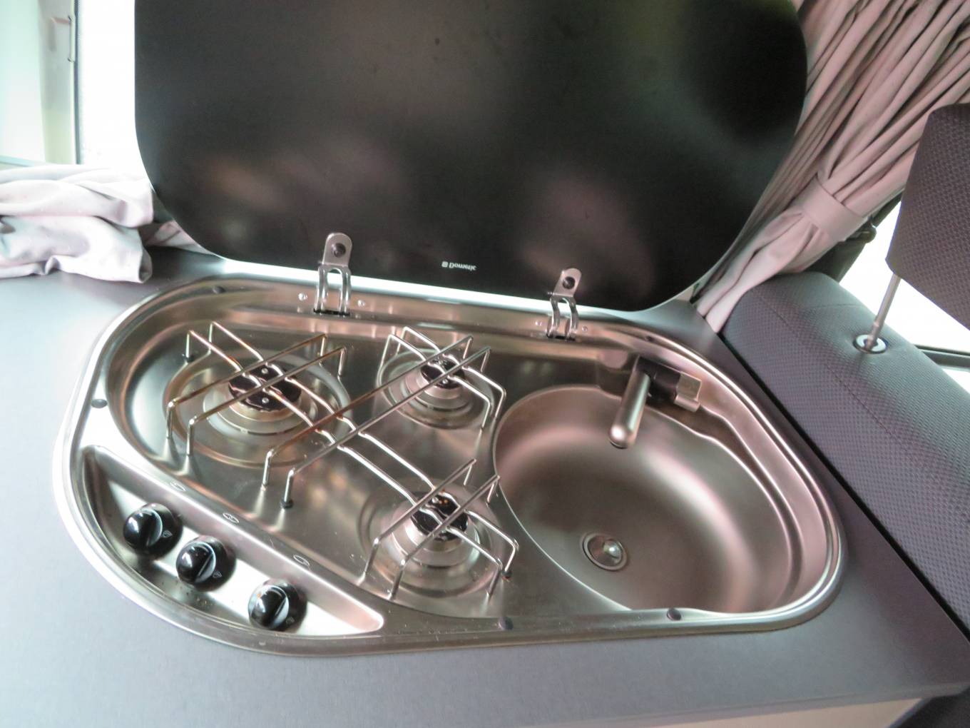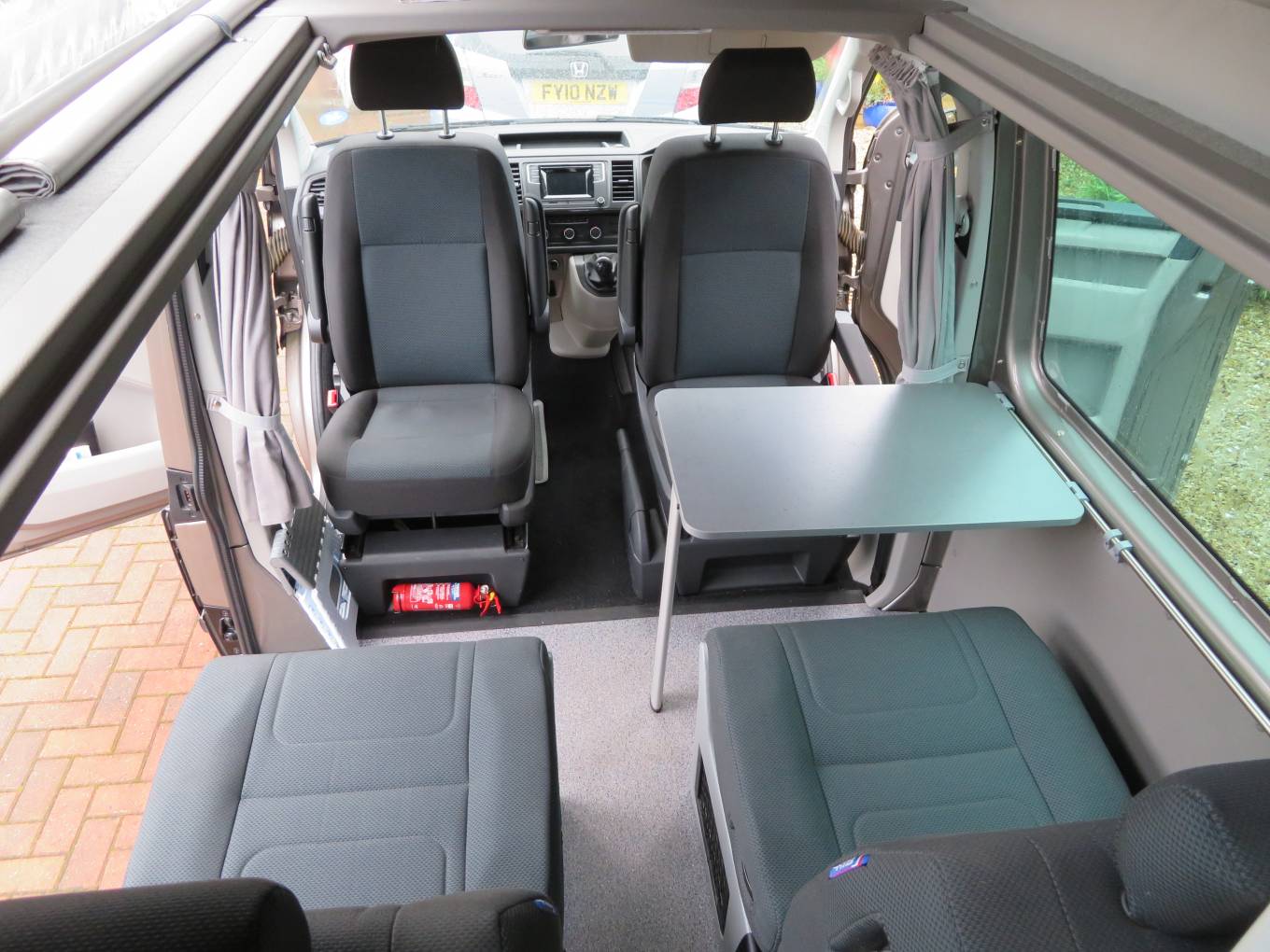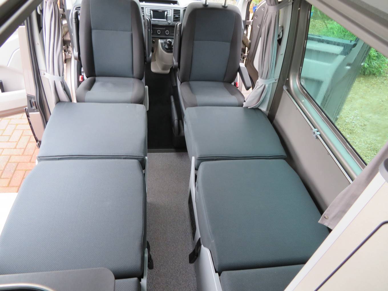 Built on the kombi base vehicle this is a rear galley kitchen style camper with 3 burner hob, sink, warming oven / grill, 50ltr compressor fridge, fresh & waste water tanks, leisure battery, mains hook up, wardrobe and storage drawers. The rear 3-point belted seats with head rests and storage beneath, fold flat and combined with the swiveling cab seats create 2 single beds. The rear section can be zoned off for use of the standard 465 porta potti. Features include air conditioning, privacy glass, front & rear parking sensors, heated windscreen, tyre pressure monitor, trip computer, Bluetooth, DAB 6.5” touchscreen radio with App connect, Cat 1 Alarm, driver & passenger cab swivel seats with armrests, electric cab windows, electric adjustable heated folding mirrors, deadlock central locking, driver & passenger air bags, colour coded roof bumpers & mirror housings, 2 opening rear windows and colour coded Fiamma wind out awning.