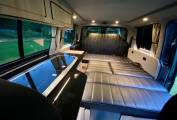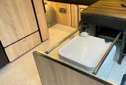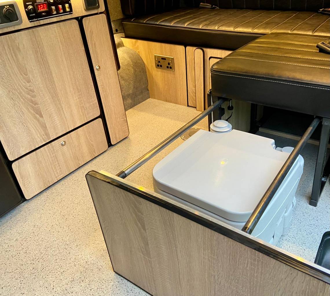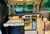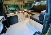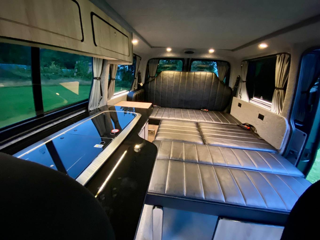 The van has a unique L shaped rear lounge which converts into a good size double bed. The seating area has two 3 point seat belts and one side facing lap belt. The kitchen area has a twin gas hob combined sink with cold water tap, this is recessed into a safety glass worktop. There are storage cupboards below and at high level with soft close fittings, all with internal lighting. The fridge is housed underneath to give maximum room in the dining area. The front twin seat swivels and is complimented by a swivel table, as well as the removable table at the rear. The pop top roof gives additional head room in the van, along with making the second double bed. There is a recessed diesel heater in the floor with an external breather pipe, this has a digital controller. There is a 100w solar panel on the roof which charges the leisure battery, along with an external 240v hook up point.