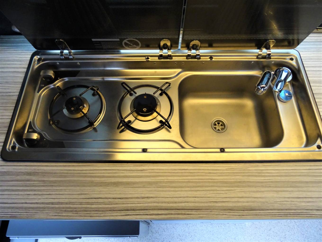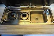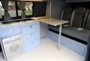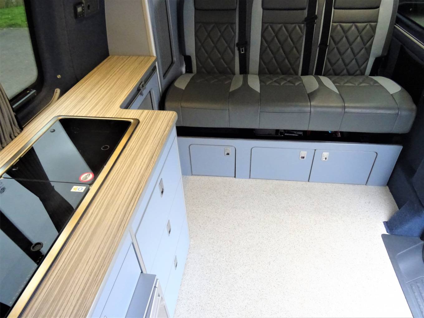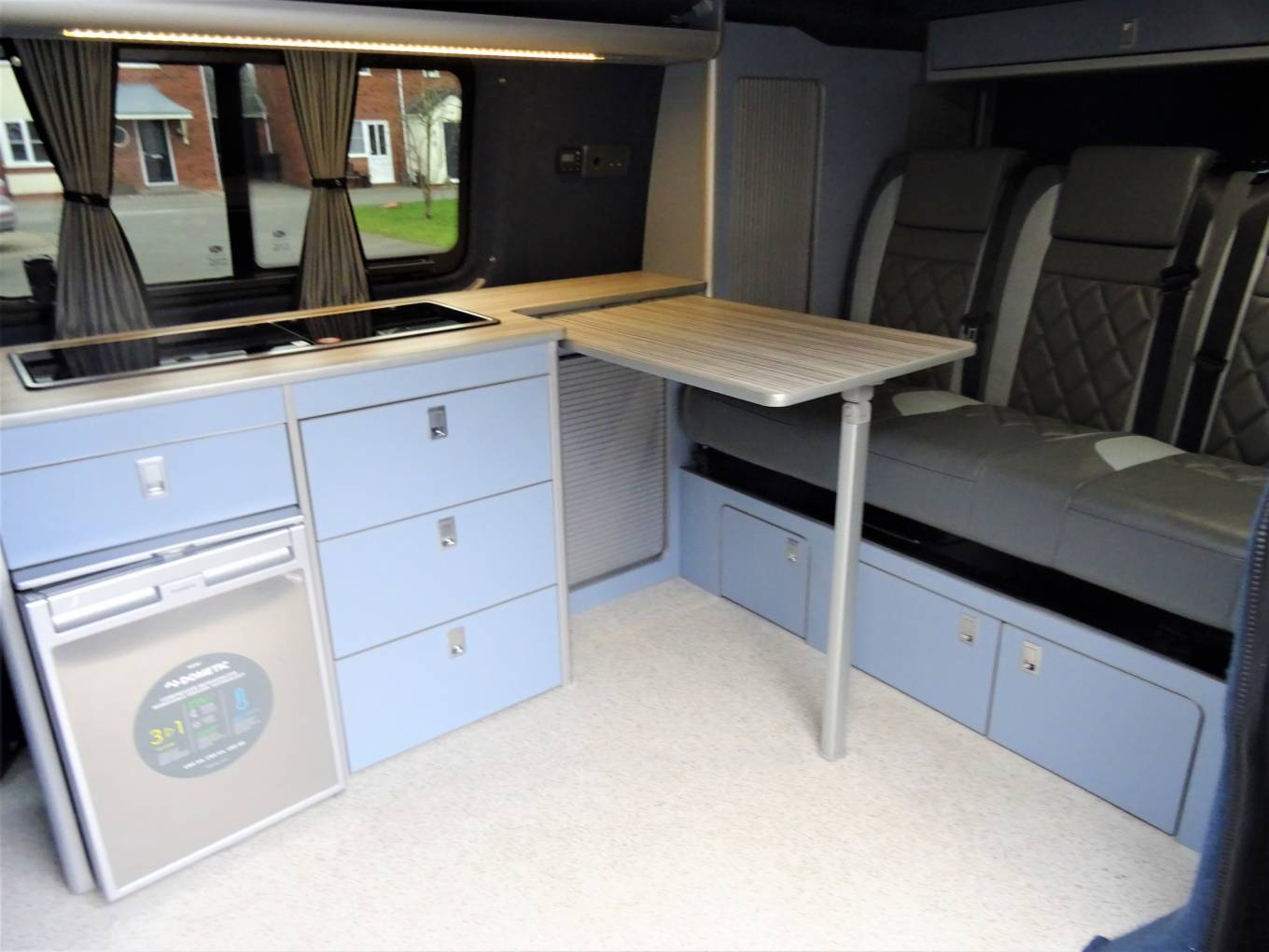 We have a choice of 2 tables (one door stored) soft close drawers, concertina side slide storage, 2 gas burner hob, sink and tap, 12v Dometic fridge with removable freezer box. We have strip and spot lighting, ceiling light is blue or white and dimmable and the ceiling pushes up. There is under seat storage, gas bottle cupboard, and diesel heating. At the rear is a solid tailgate door giving us extra warmth.