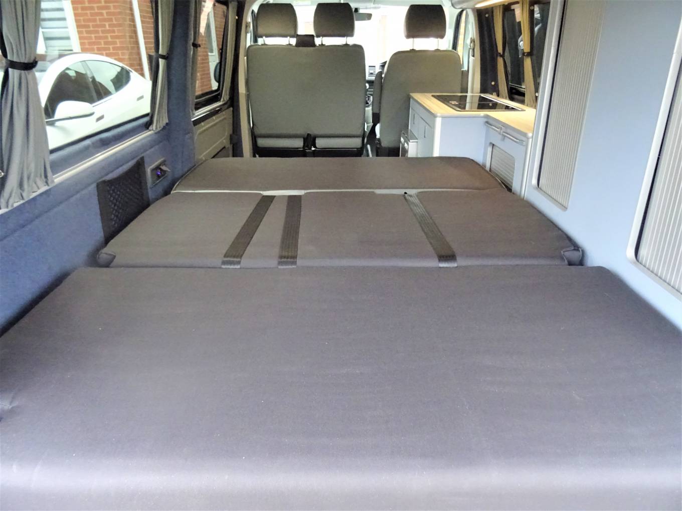 Well thought through on the important points, we have a double twin belted front seat - unlike many it is quick and easy to swivel, very smooth with rollers and rails and a large encased steel under seat storage hold. There is a wide (6ft 1" x 4ft 3") 3 belted seat, rib style bed with multi positional twin ended sections, great for reading and lay-ins and being LWB there is left over space. There is a deep rear parcel shelf/seat, that will move up for storage flexibility. There are black out curtains.