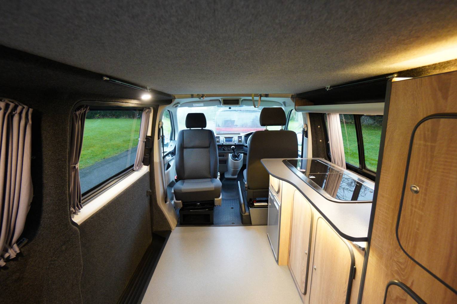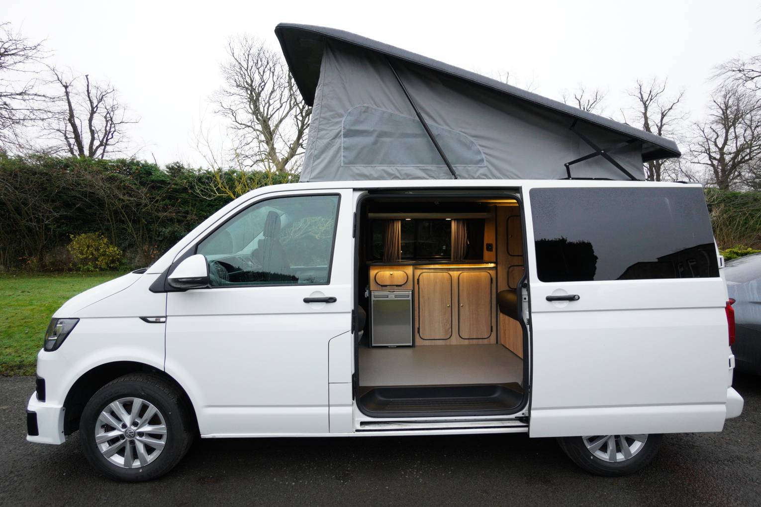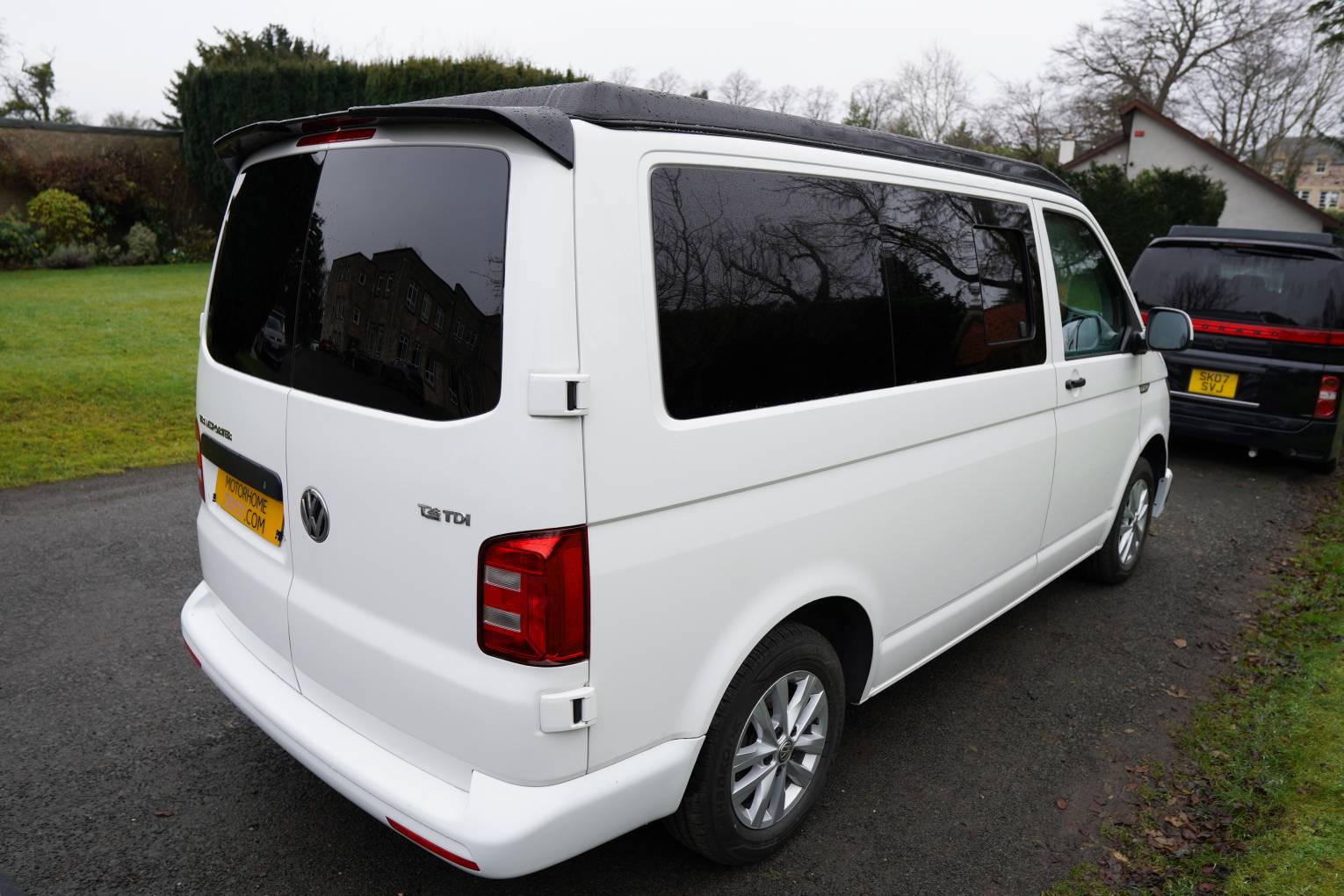 For sale we have a fantastic late 2016 SWB VW T6 Transporter, 4-berth, 4-seatbelts campervan. This is a brand-new conversion completed to an extremely high standard. The van has covered 43,168 miles with a good service record with the timing belt and water pump being replaced at 40,588 miles. It has the 2.0 litre (Euro 6, ULEZ compliant) engine with a 5-speed gearbox, 16” VW alloys with van rated Hankook tyres along with a newly fitted Sportline body kit.
