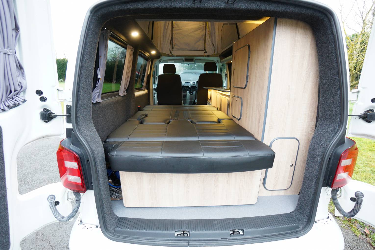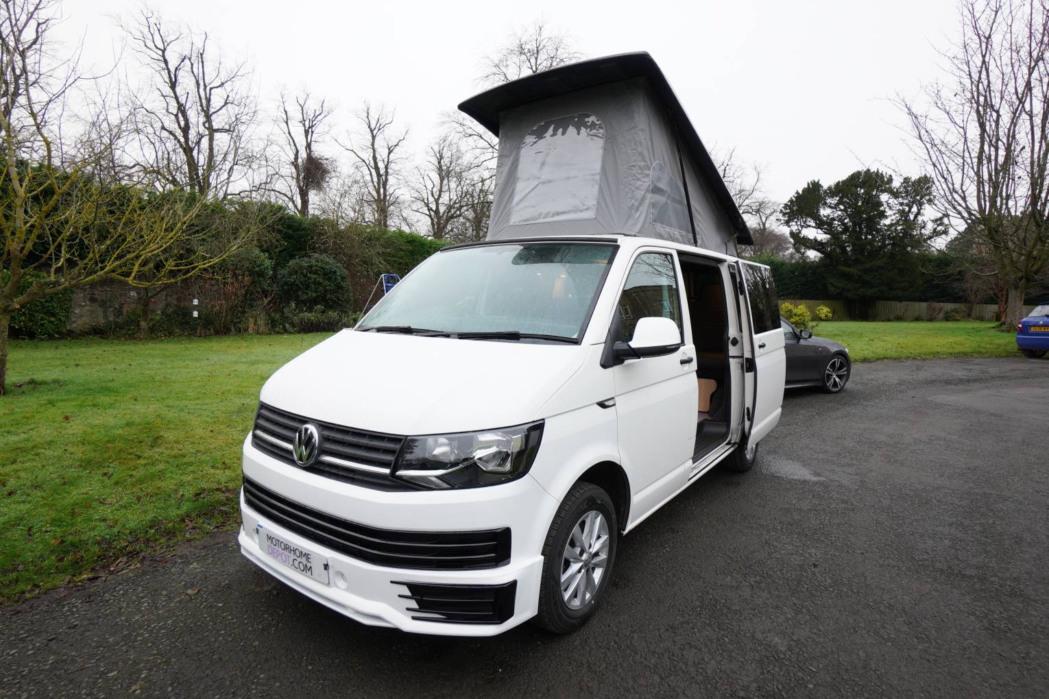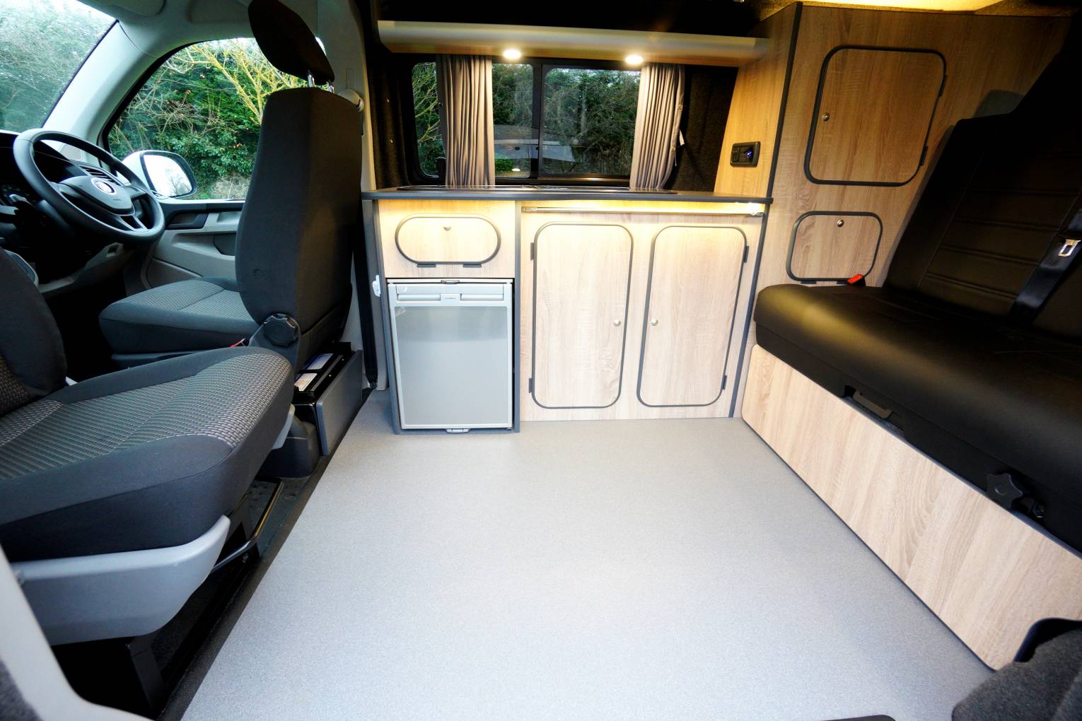 For sale we have a fantastic late 2016 SWB VW T6 Transporter, 4-berth, 4-seatbelts campervan. This is a brand-new conversion completed to an extremely high standard. The van has covered 43,168 miles with a good service record with the timing belt and water pump being replaced at 40,588 miles. It has the 2.0 litre (Euro 6, ULEZ compliant) engine with a 5-speed gearbox, 16” VW alloys with van rated Hankook tyres along with a newly fitted Sportline body kit.