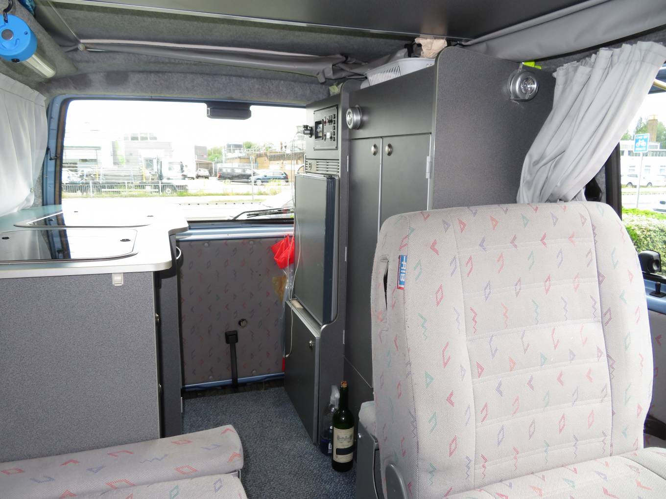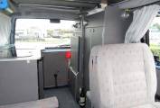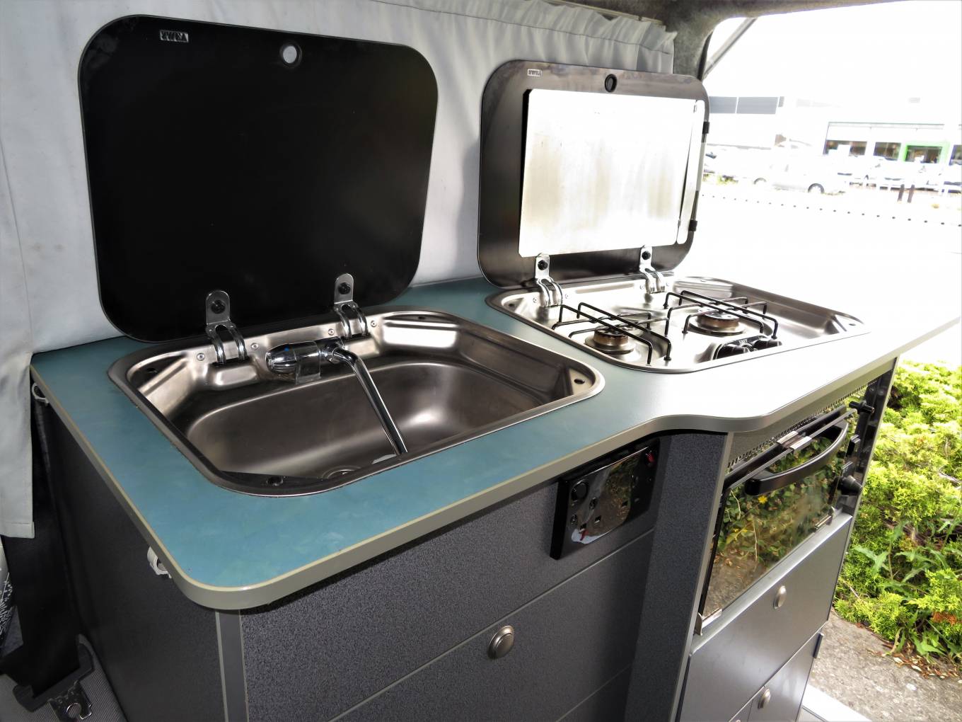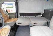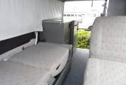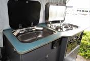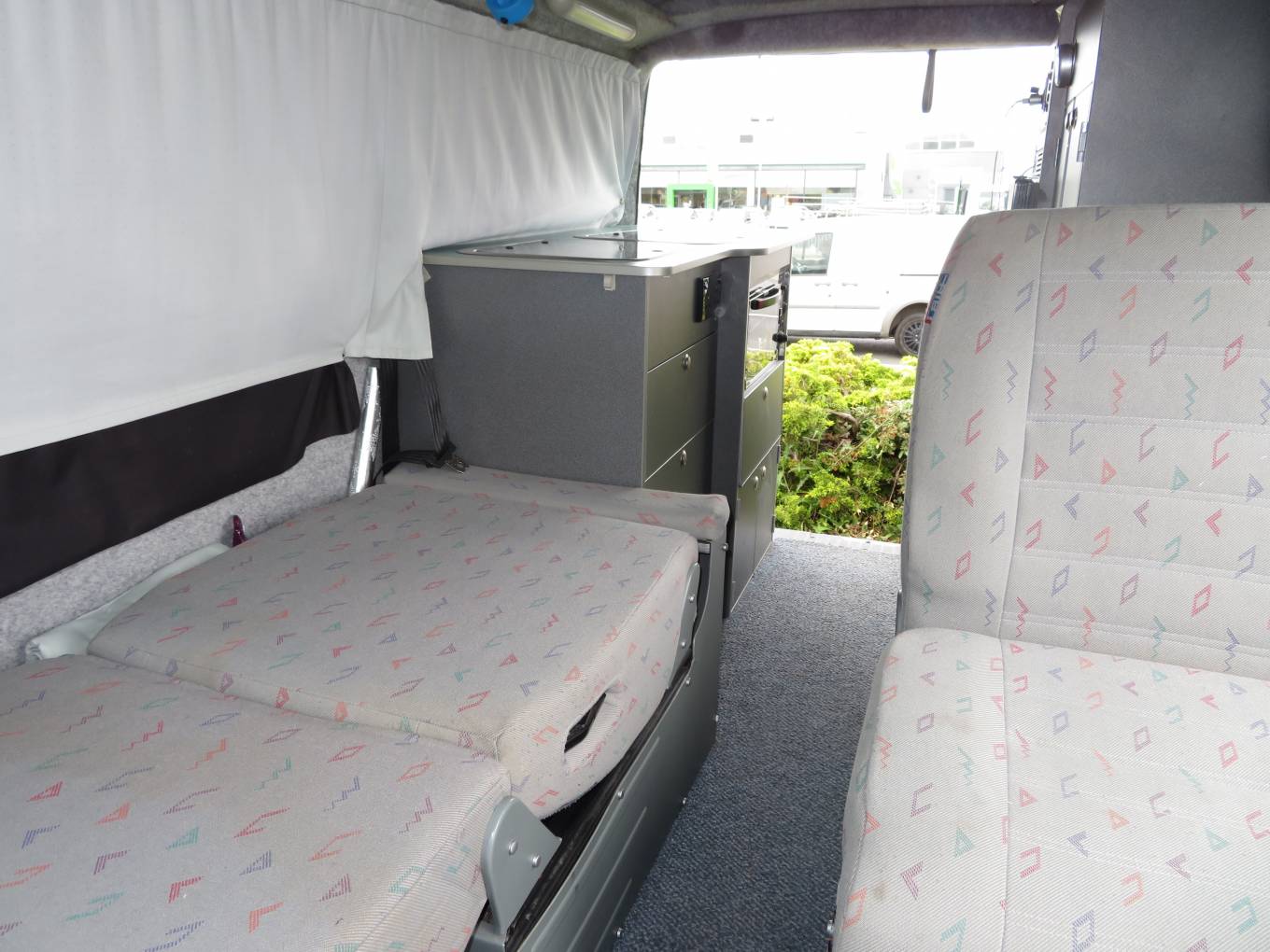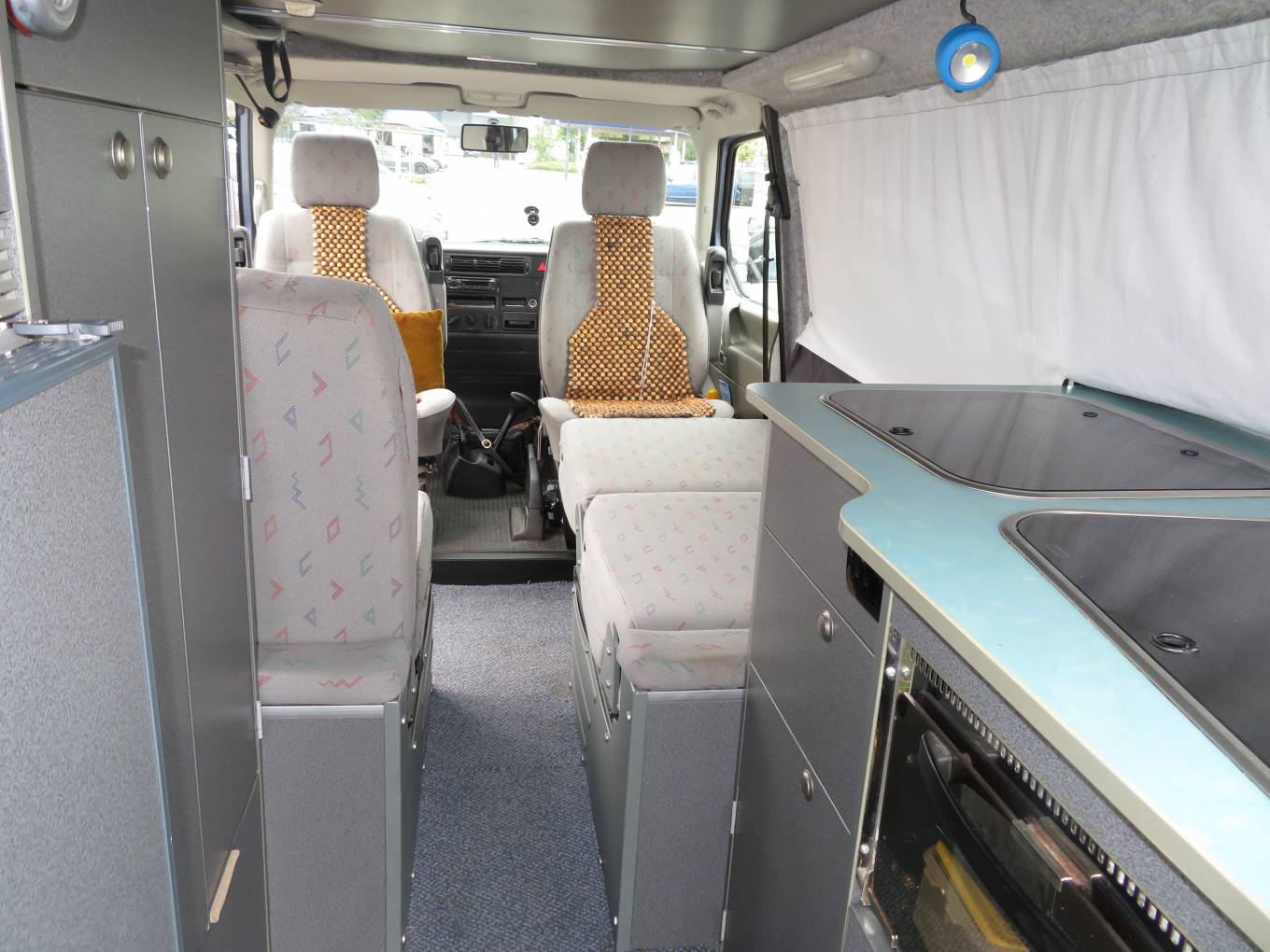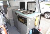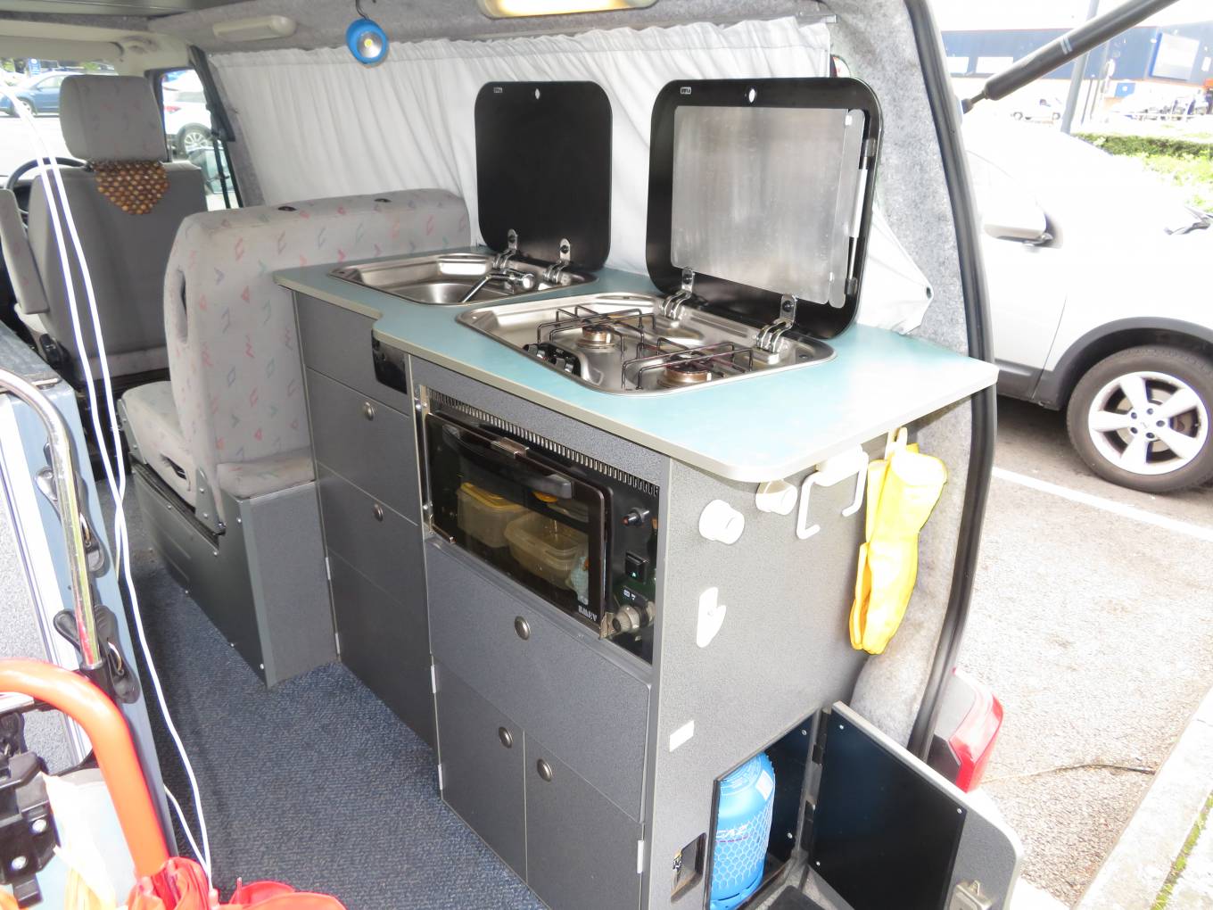 In the rear the motorhome has a good living area, giving you plenty of space and storage for a van of this size. The two front seats swivel round and with two further seats there is space for 4 to sit down and relax. To the rear there is well equipped kitchen area including gas hob with two gas burners, oven/grill and fridge with freezer compartment. This camper comes with a sink with cold water. Please note that there is no heating system in the camper.