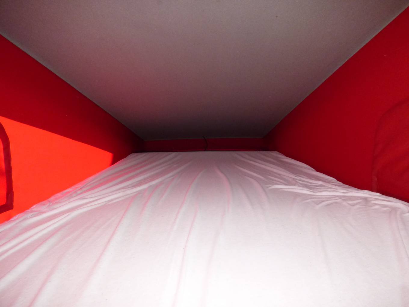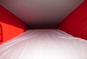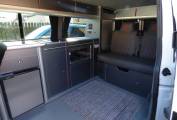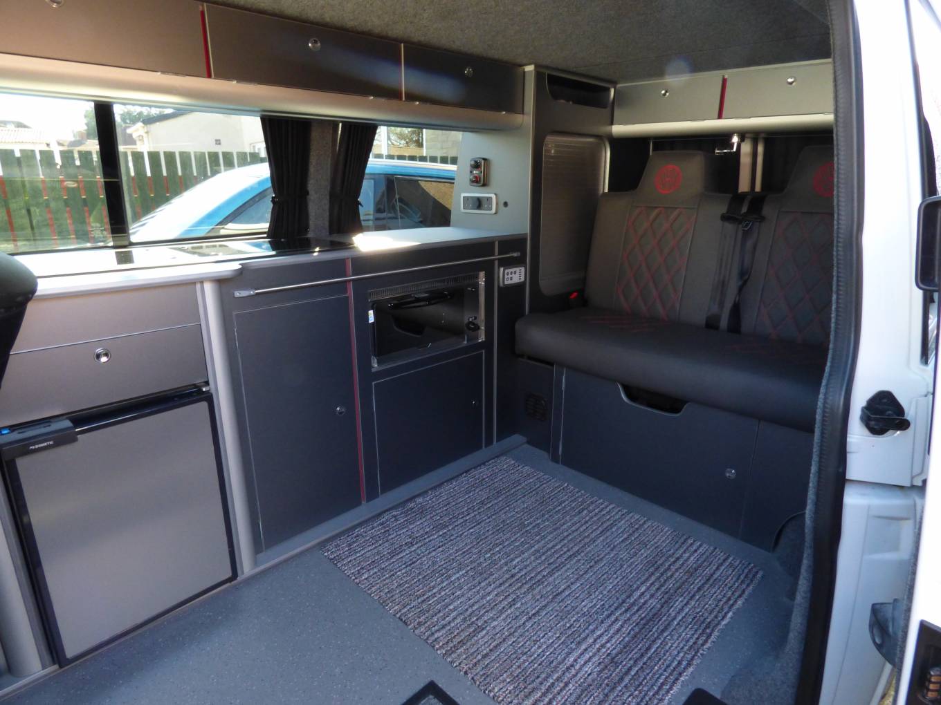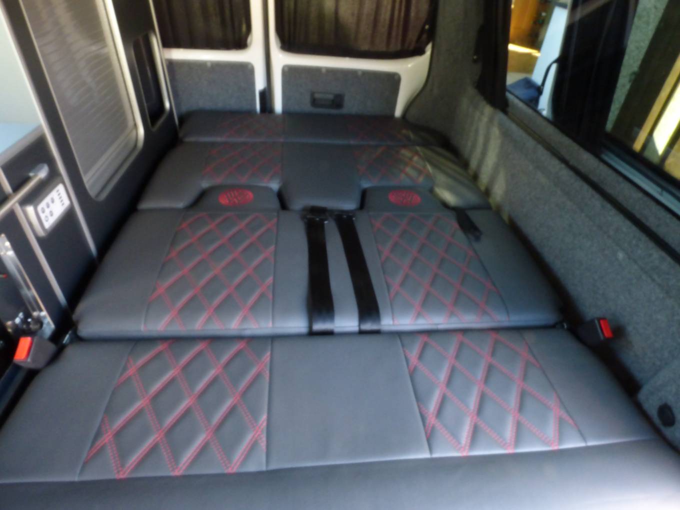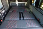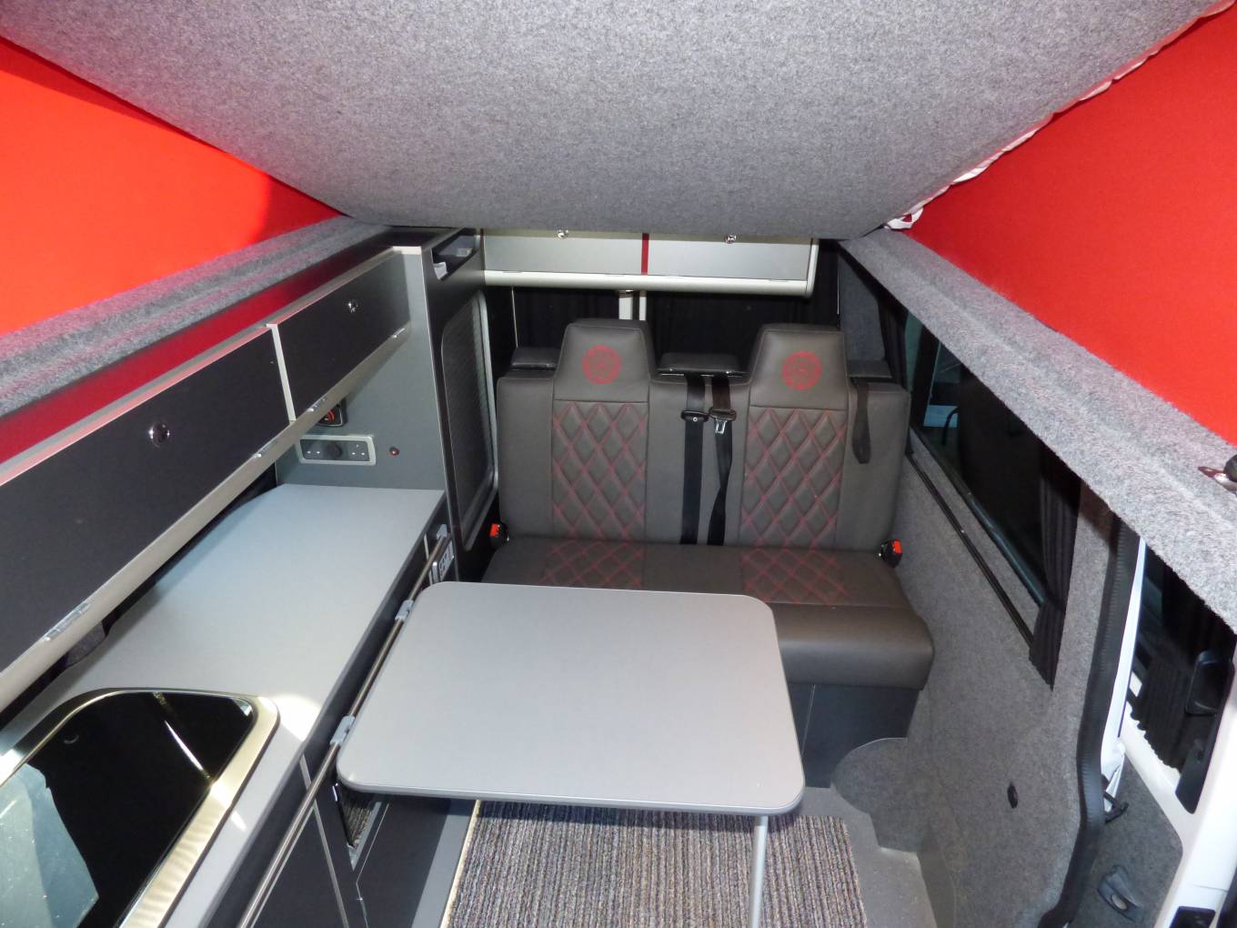 The interior is immaculate with leather seats and a leather rock'n'roll bed. The beauty of the long wheelbase version means there is plenty of room between the rear of the passenger seats and the end of the bed. The "kitchen" area follows the tried and tested formula of the glass screen housing a sink and hob above storage space incorporating a fridge and a gas grill. There are LED striplights over the kitchen area and plenty of individual lighting throughout.
