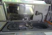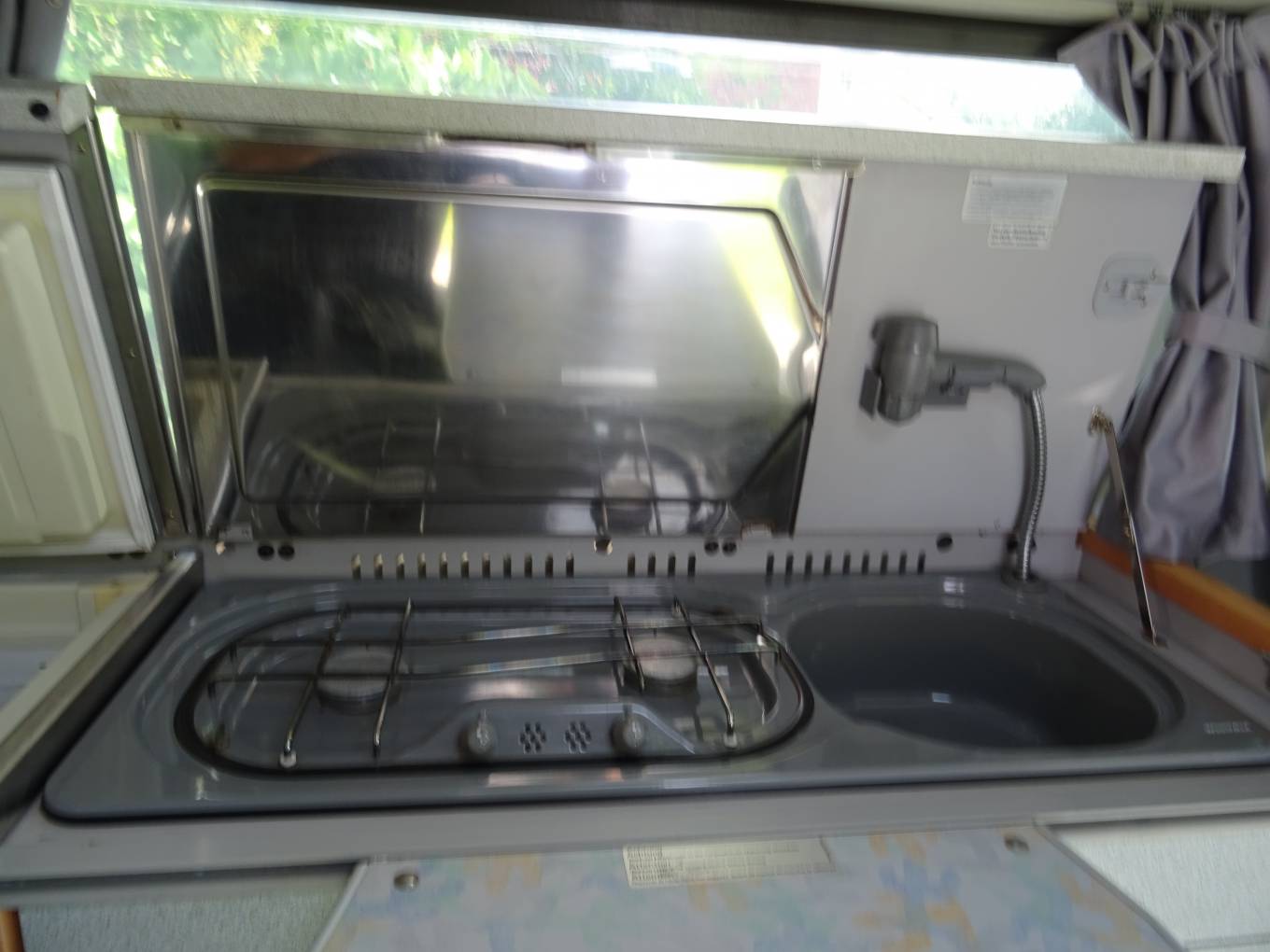 There are also curtains all round, a tilting window adjacent to the cooker and a ceiling vent.
