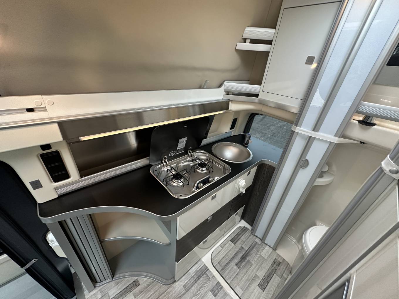 includes a two-ring gas hob, sink with hot and cold mixer tap, compresor fridge