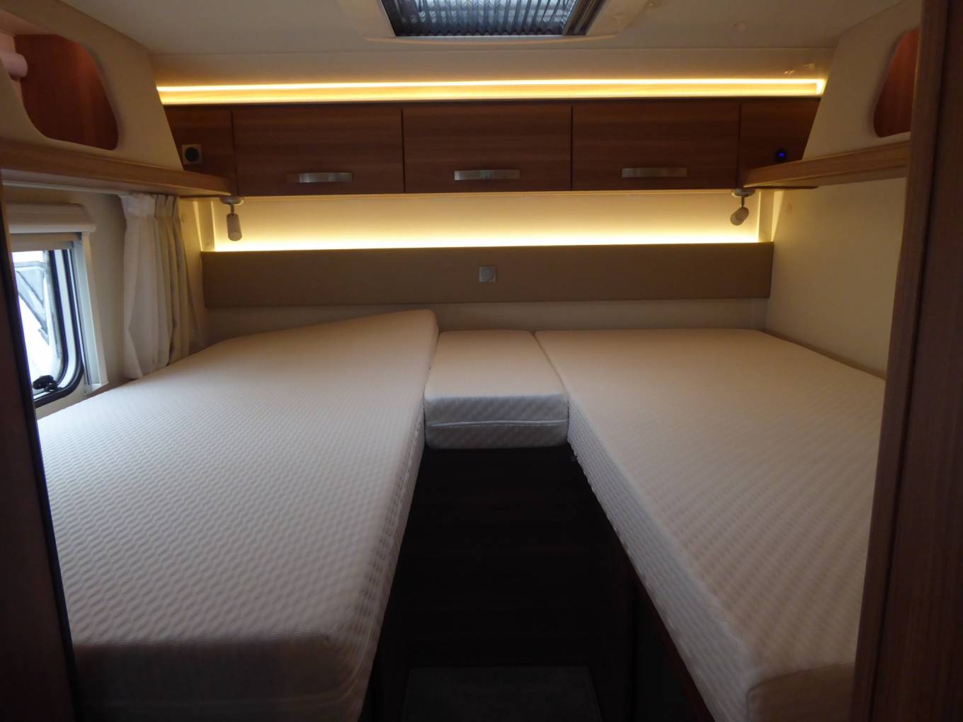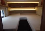 At the back of the vehicle is are two raised single beds above an externally accessed garage.
