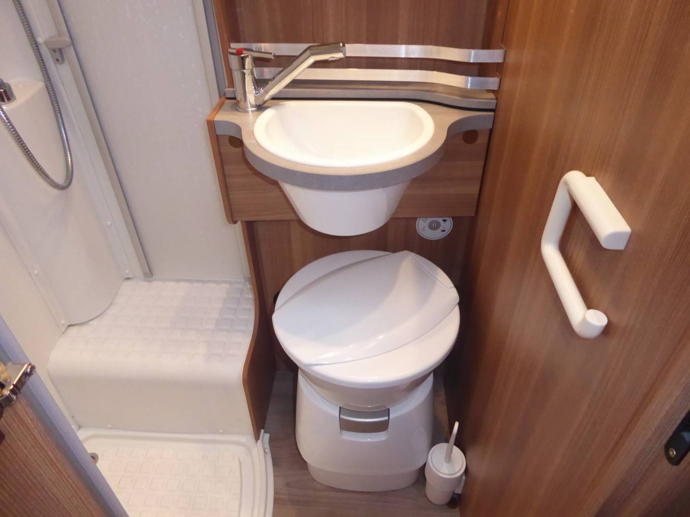 Behind this dining/leisure area is the bathroom, which contains a toilet, hand basin, and a screened shower.