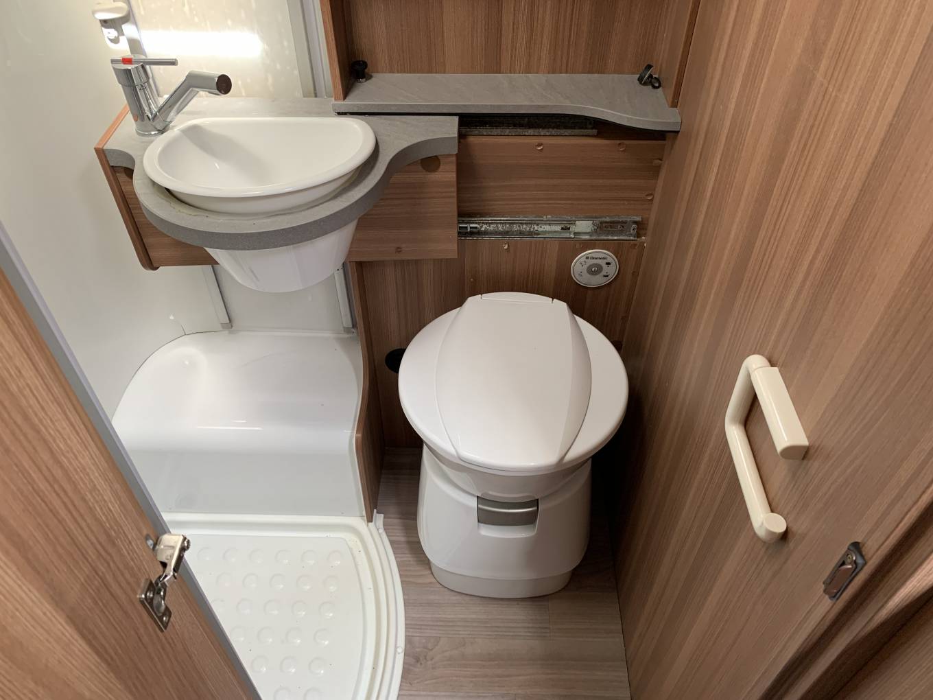 The layout of this motorhome is the Large Fixed Bed at the rear which has surrounding storage units and sits on top of a rear garage that as you will see from the photos has plenty of space to store all your belongings for a lengthy adventure. Infront of the bed you have the spacious washroom which has everything you need to refresh and recharge after a day of adventure including the desired separate shower cubicle; toilet; storage unit; vanity mirror and handwash basin.