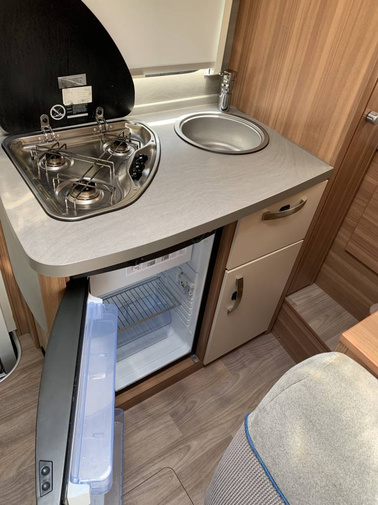 To the front of the bed and the washroom you have a wardrobe space and the kitchen area, the kitchen area is clean and modest and gives you 3 gas hobs and a good sized fridge with plenty of freezer space.