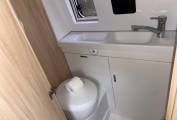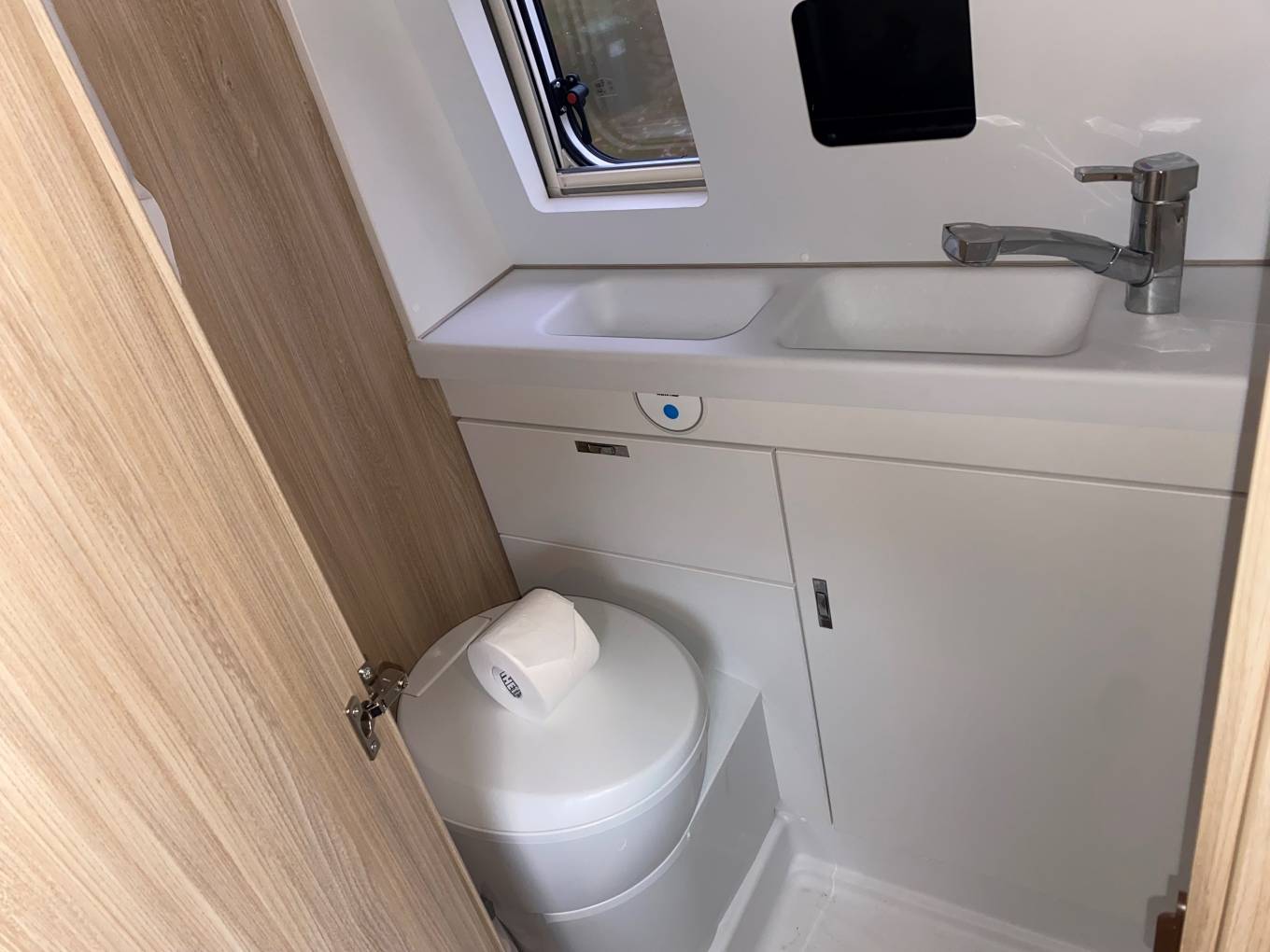 Adjacent to the kitchen is the washroom, fitted with a cassette toilet with an electric flush, shower and hand wash basin.