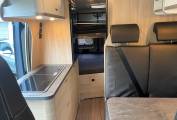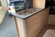 To the center of the van is the kitchen space, fitted with a sink, mixer tap, 2 x burner gas hob, a top counter fridge and plenty of storage all round.