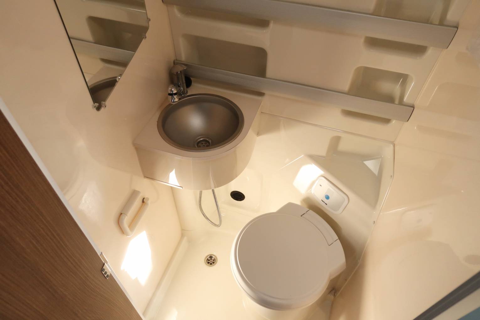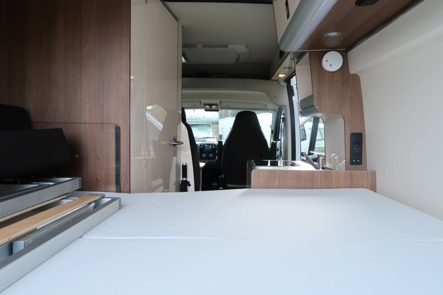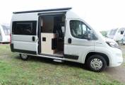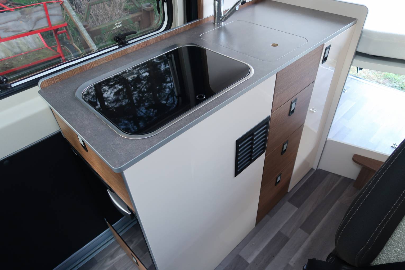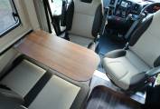 Behind the front seats is a 2 seater sofa fitted with 2 seat belts. The stylish dining tables fixes to a side rail and the table can be removed and stored away if you require more room to sprawl out. On the driver's side is the kitchen which has a fridge, a 2 gas burner hob and a sink with a mixer tap. There is a surprisingly large worktop area for food preparation and the drawers are all soft close. Opposite the kitchen is the washroom which has a shower head built into the tap, a Thetford swivel cassette toilet, a wash basin with mixer tap and a bathroom mirror.