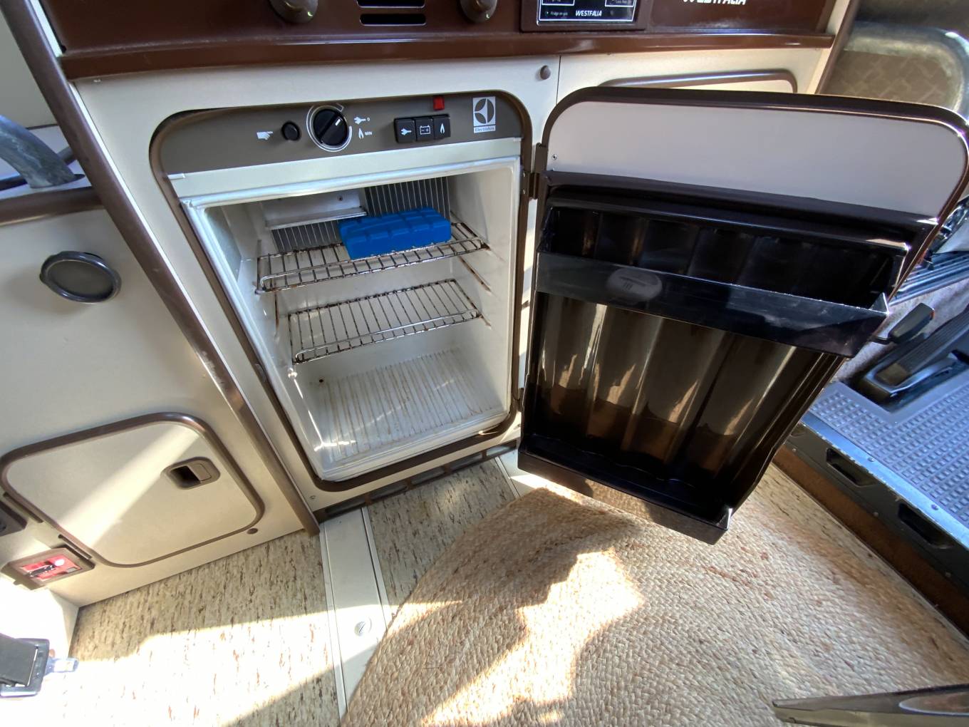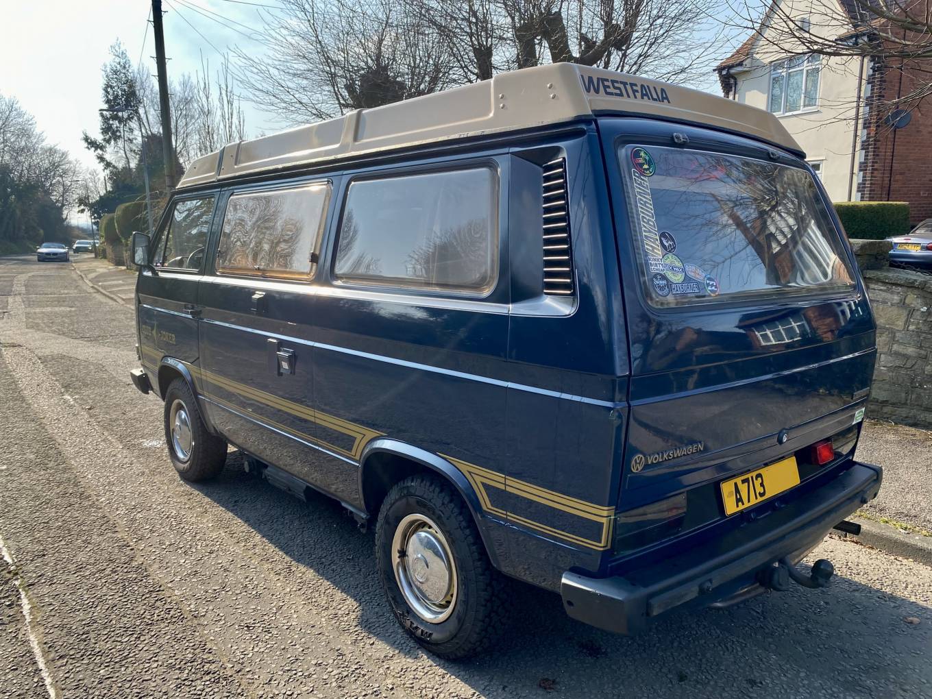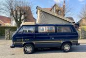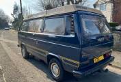 Here we have a lovely example of the desirable Westfalia Club Joker in Kurilen Blue with Samos Beige roof. The Club Joker is very well specced for the time and features refillable gas tank, onboard fresh and waste water tanks, insulation and double glazed windows, upgraded seats and upholstery, rear headrests, 3 way fridge, 2 burner hob, swivel front seats, the option of two table, the large one for dining and a small swivel one near the front seats for coffee etc and pop top roof with opening skylight, blackout curtain and double fold down bed. This particular example also still has the factory supplied flatscreens for the opening side window and rear hatch. There is an additional hookup socket under the sliding door to allow an extension to be placed in the awning and the battery charger has been upgraded to twin smart chargers. The engine is in good running order and has been upgraded with a pair of twin dellorto carburettors and a stainless steel exhaust giving plenty of power. The tyres were replaced last year with Maxxis worm drive tyres to help with muddy campsites and the brakes were serviced at the same time.