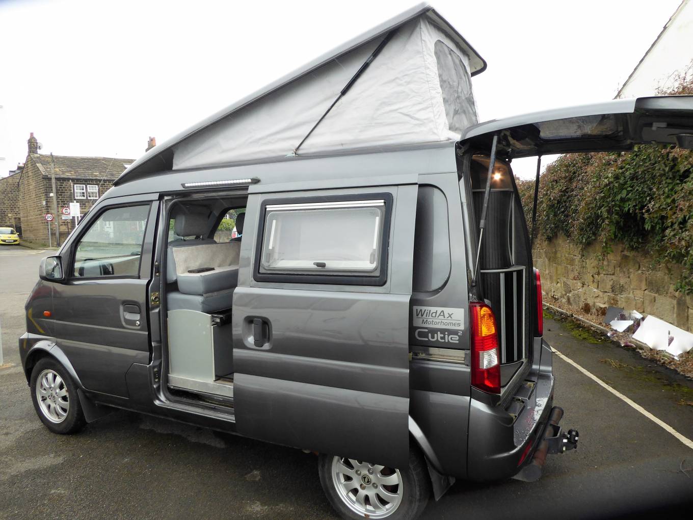 Call with any questions 01423 609985. This WildAx Cutie 2 really does live up to its name. It is built on a DFSK Loadhopper chassis and is less than 4 metres long, however packs plenty into it and its very well designed as you would expect from WildAx. First registered in 2015, it has 5 speed manual gearbox and 34,751 miles. The roof lifts easily to create extra headroom when parked up and the clever design extends to the 2 sliding doors which allow access to the habitation are on the nearside and then access to water and gas bottles on the of side. The rear seats and those folded behind the driers seat, create a double bed approx. 6 feet by 2 feet 6 inches. There are several LED lights including 2 in the rear door, which is really useful, so you can raise the rear tailgate and sit out underneath and read a book. It has a hoc with 2 gas burners, electric fridge, and sink. The upholstery is in first class condition as is the bodywork. It will come with a 12-month MOT and really is a lovely, compact campervan. Its is situated near to Bradford. Part Exchanges welcomed on this vehicle, for further information and photos please call us on 01423 609985 quoting reference 129517.