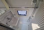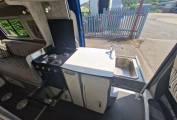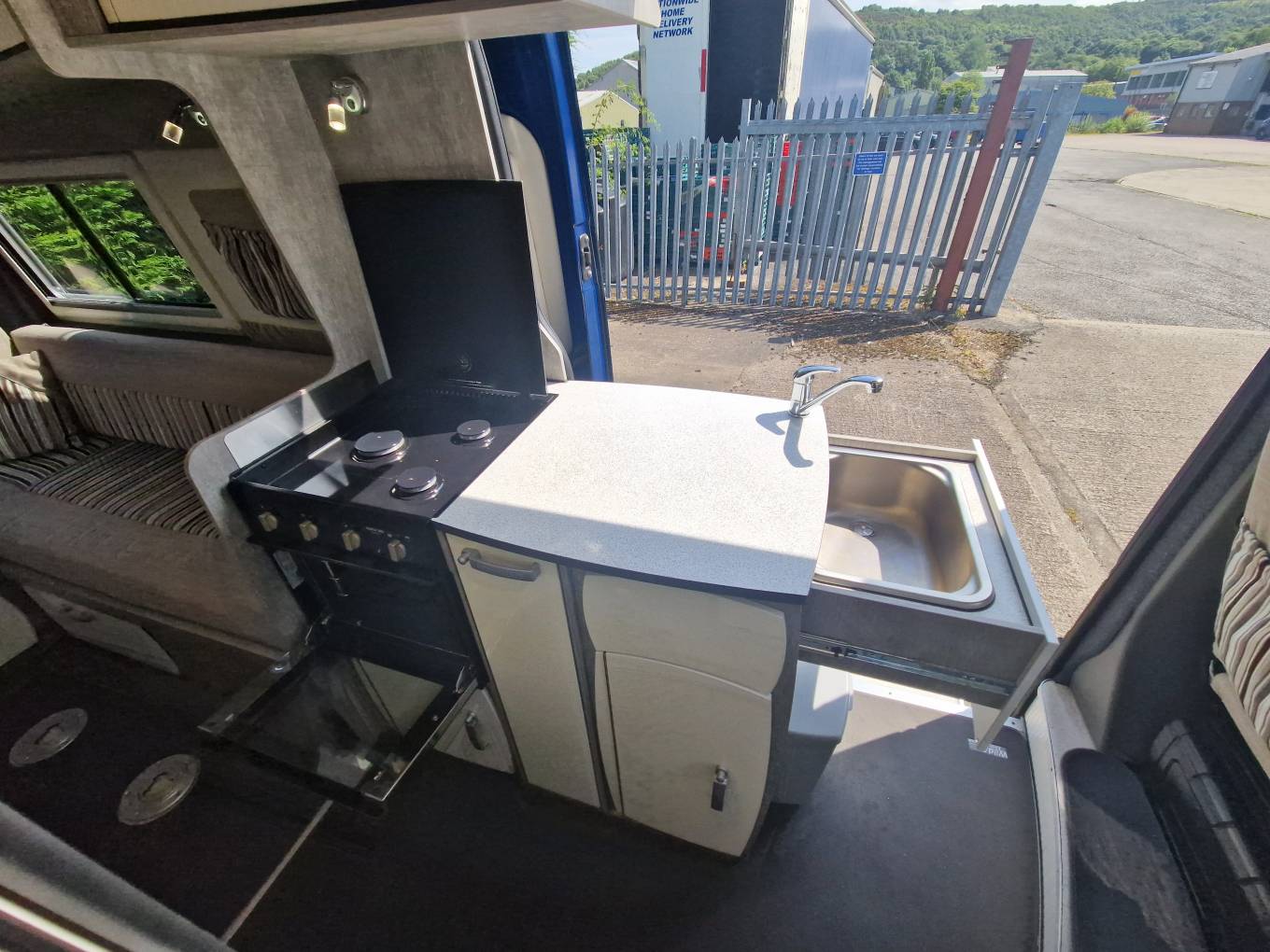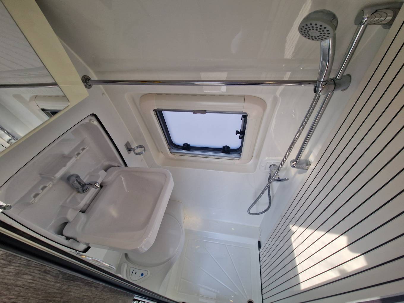 Moving to the centre of the motorhome you have a kitchen area fitted with an oven/grill combi, fridge with small freezer, hidden sink in draw giving plenty of countertop space. Across from here is a spacious washroom fitted with a shower and tray, drop down basin and a toilet cassette.