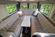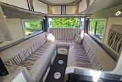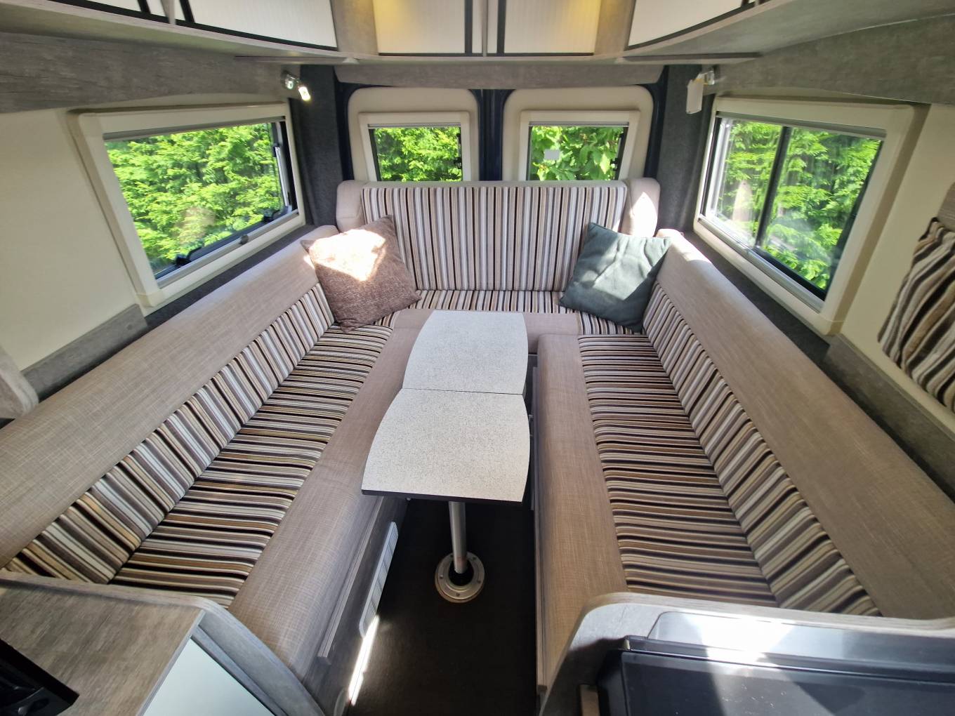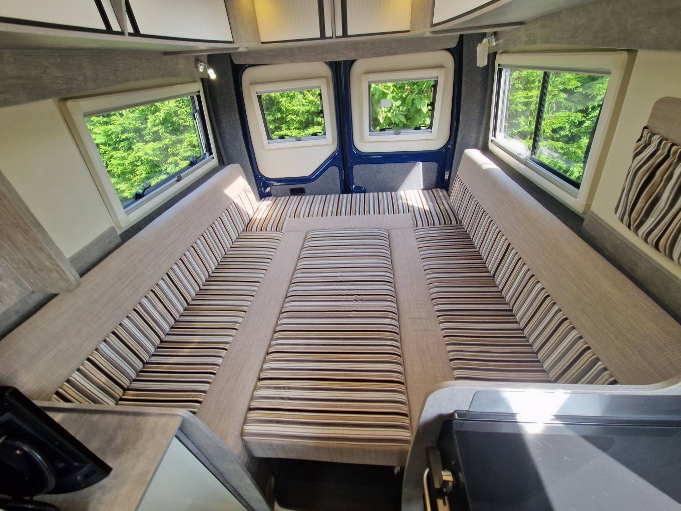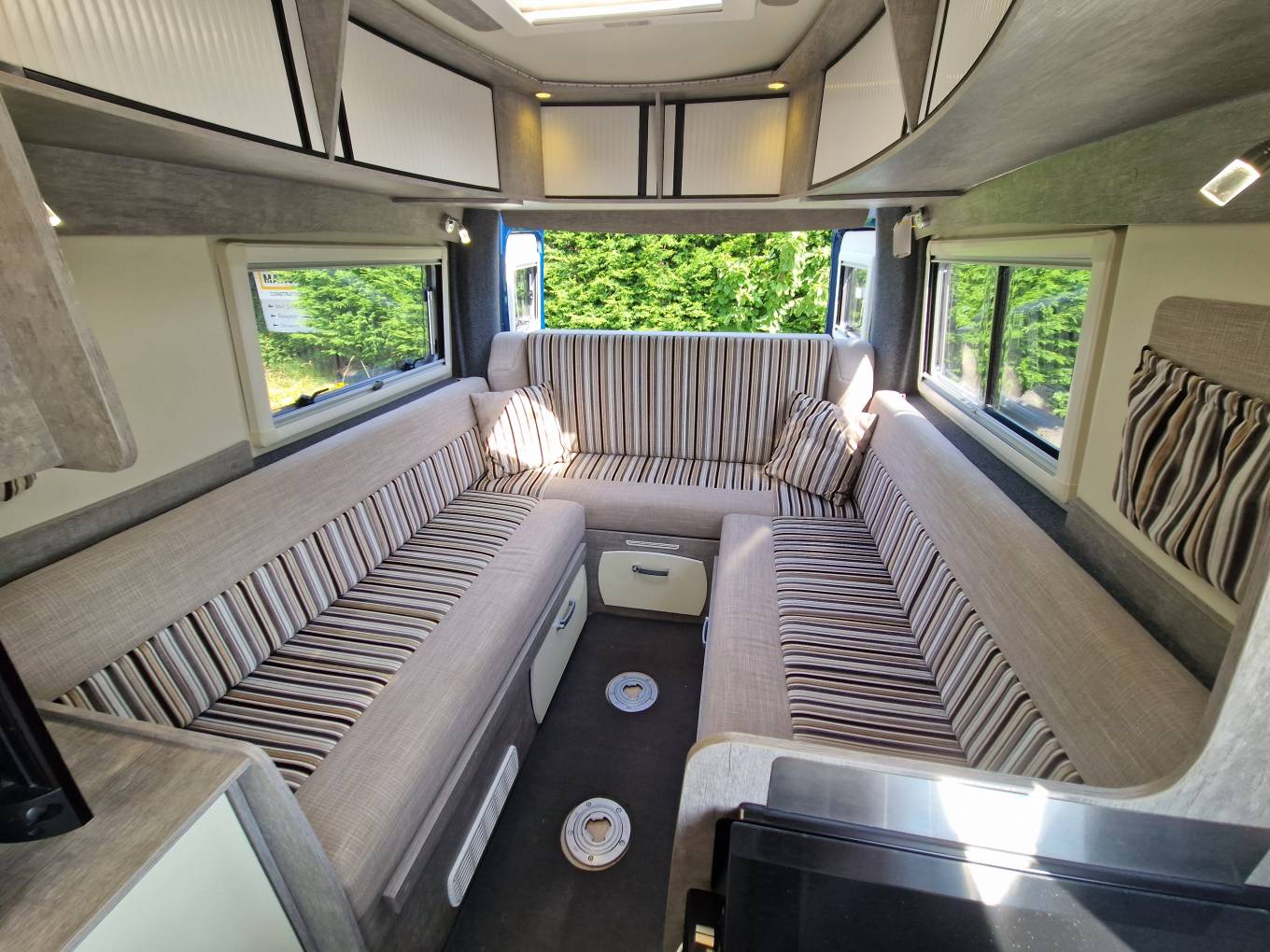 Large rear U-Shaped lounge in fantastic condition which doubles up as a large double bed. Lots of storage around the roof area and a perfect place to relax in front of the TV or a meal on one of the 3 removable tables. On an evening, removing the rear cushion which has been reinforced, sliding it into the centre of the lounge area, the bed can be ready in the less time than it takes to boil the kettle!