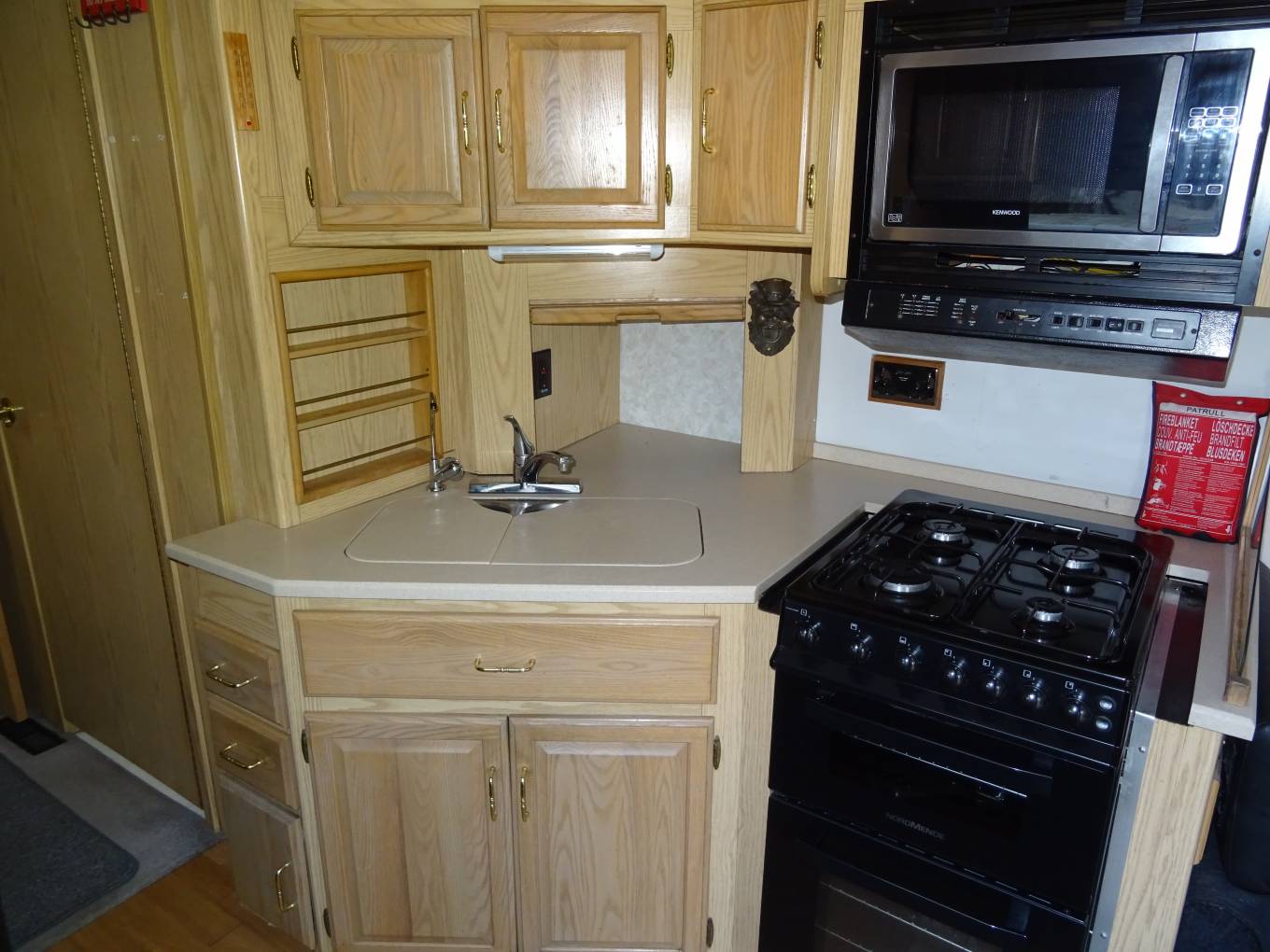 burner hob, grill and large oven. There is a double drainer sink, microwave,
